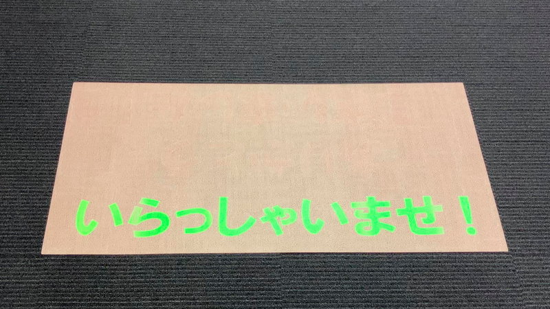 見る方向・視点によって表示が変わる、アイキャッチ性の高いフロアマットです。天井照明のある床に置かれた本製品に近づくと、緑色に光った文字や絵柄が出現します。無色透明なホログラムシート(リップマンホログラム※1)を応用した製品であり、離れた位置からでは表示は消えているため、マットの柄や空間デザインを損なうことなく、床への案内、メッセージを伝えることができます。