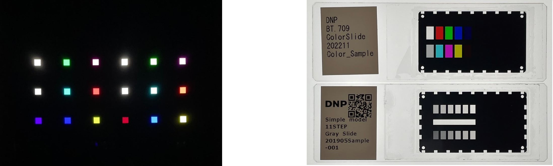 一般社団法人 映像情報メディア学会(ITE)提供の「超高精細・広色域標準静止画像」「超高精細・広色域標準動画像」 を基に撮像機器の試験、評価を目的とした透過型テストチャートです。 |