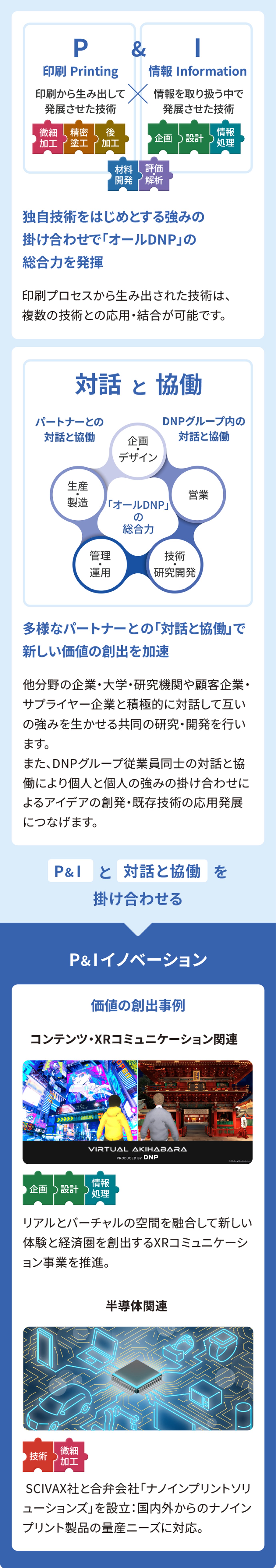 DNPは世界でも稀な総合印刷会社として、PとIのトップクラスの技術・ノウハウを豊富に保有しています。多様な技術を常に最先端のものに磨くとともに、営業・企画・製造・管理等の強みと掛け合わせて、社会課題の解決につながる革新的な“新しい価値”を生み出したいと考えており、そのことを「P&Iイノベーション」という事業ビジョンで示しています。