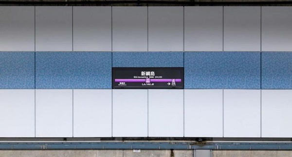 司馬:従来の建材では実現しにくい表現という点では、新綱島駅(東急新横浜線)の対向壁もユニークです。駅のある綱島(横浜市港北区)は鶴見川の流れる「川の町」ということで、駅のホームのデザインテーマが「水」でした。そこで、水の雰囲気をつくり出すため、さざ波をイメージしたブルー系のスクエア柄をあしらいました。こうしたデザインが建材として表現できるのも、アートテックならでは!です。