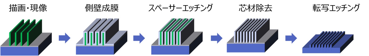○描画装置によって形成したパターンに成膜・エッチングを施してパターンの密度を2倍にするダブルパターニング(Self-Aligned Double Patterning:SADP)を活用して、NILテンプレートの微細化を実現しました。