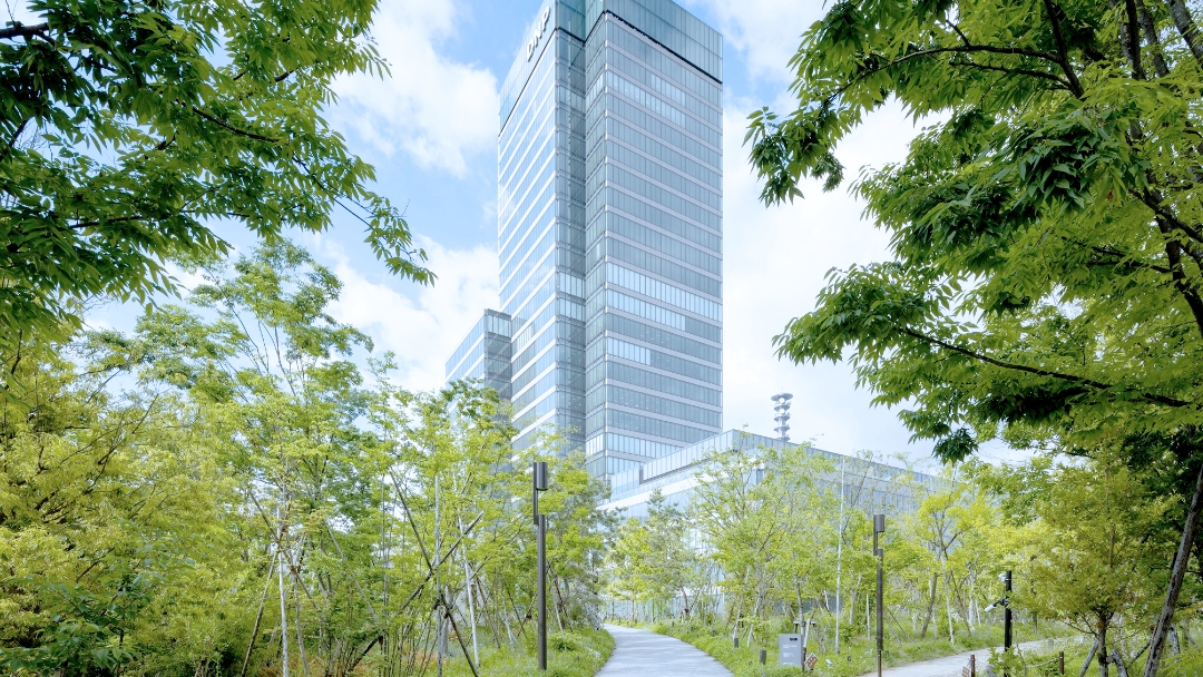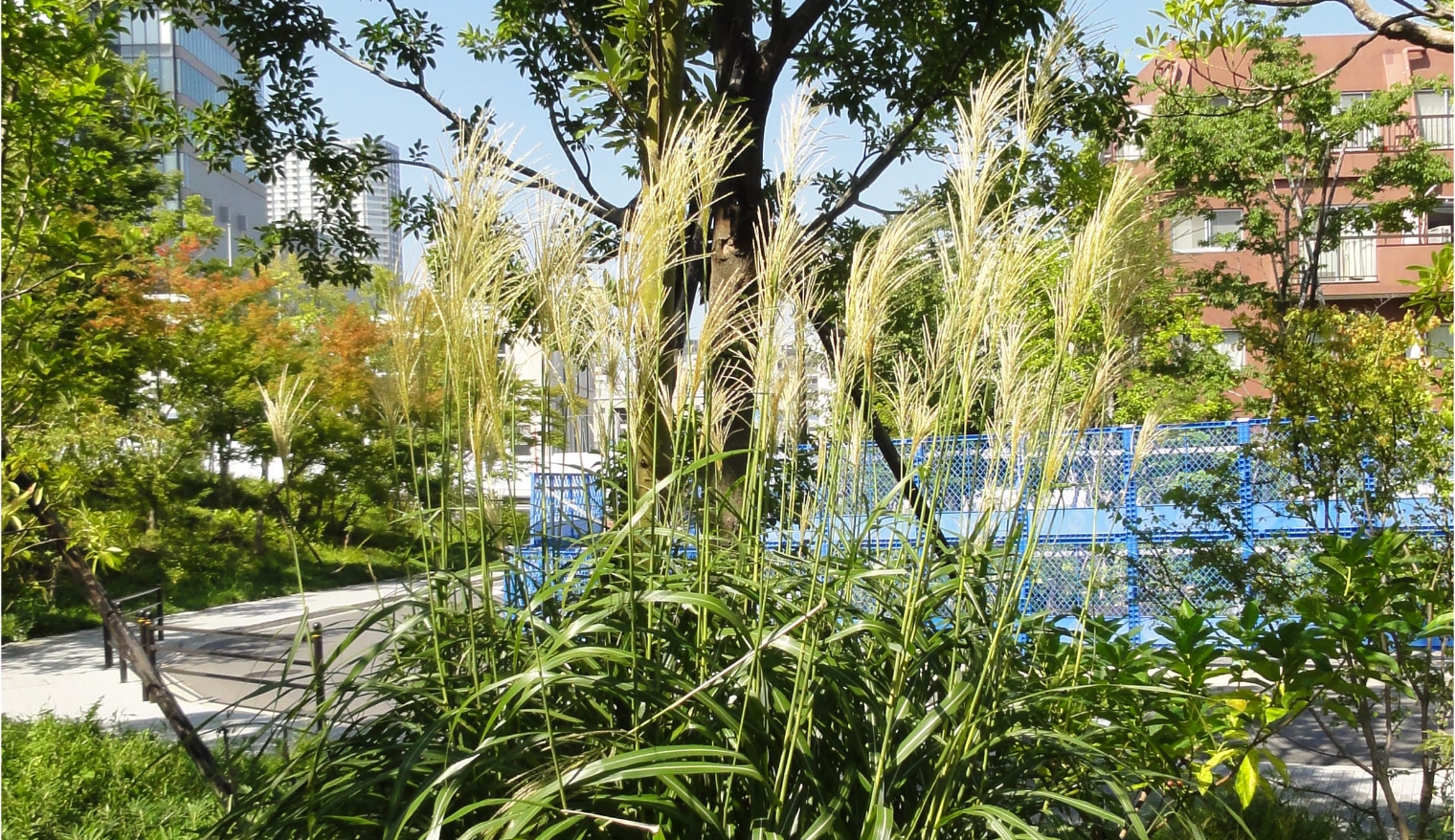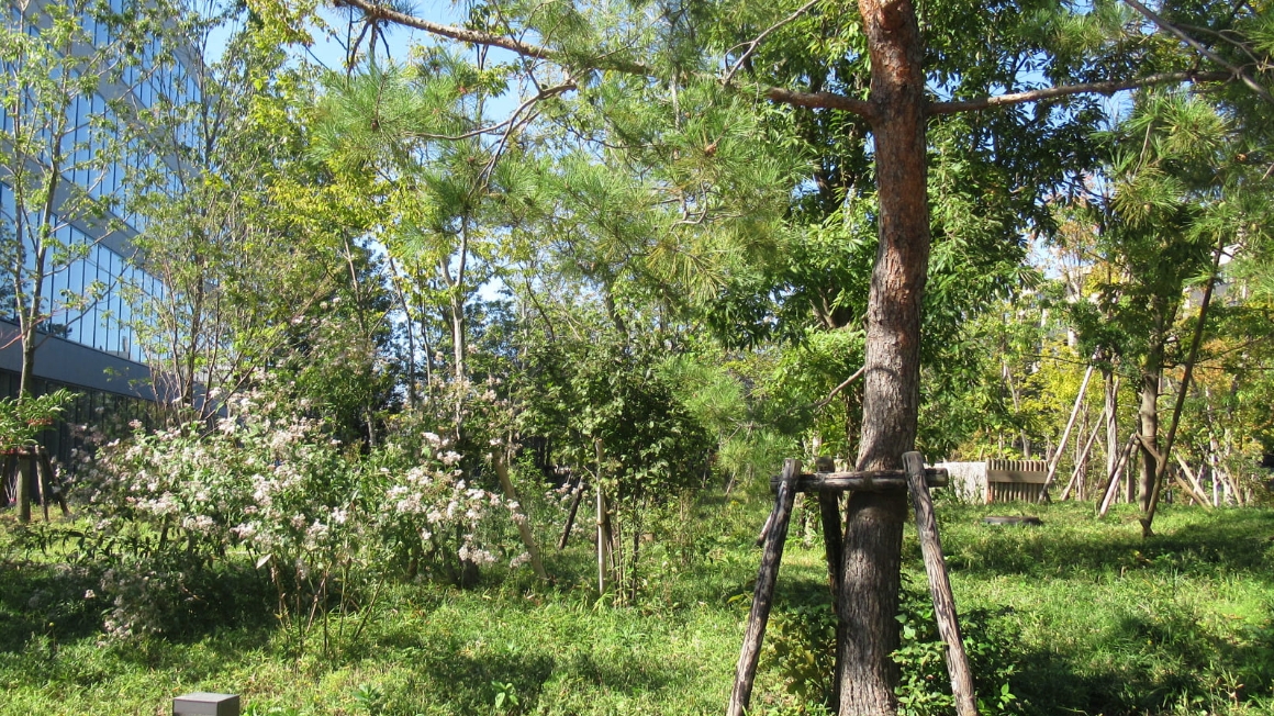 DNP市谷加賀町第2ビルの正面ほか、いくつかのエリアに、武蔵野の森を再現する重要な種の一つ、ススキを配しています。