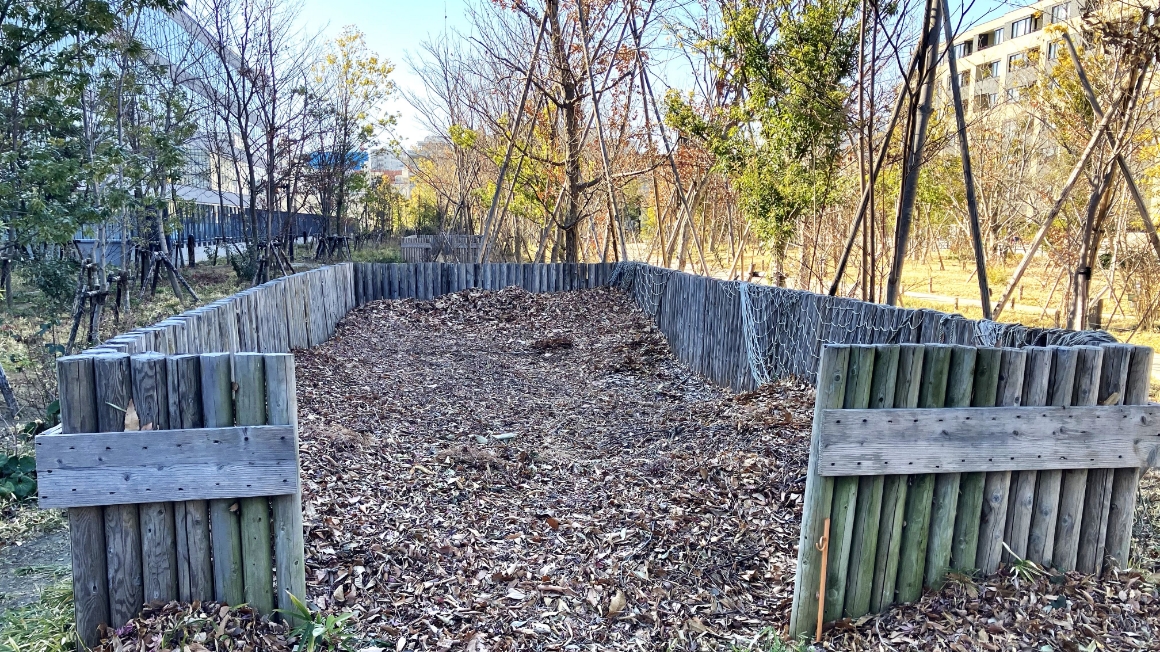 落ち葉や小枝は緑地内に乱積みし、舗装面から集めたものはコンポスト(堆肥をつくる容器)に集積。緑地内の植物サイクルの形成をめざしています。