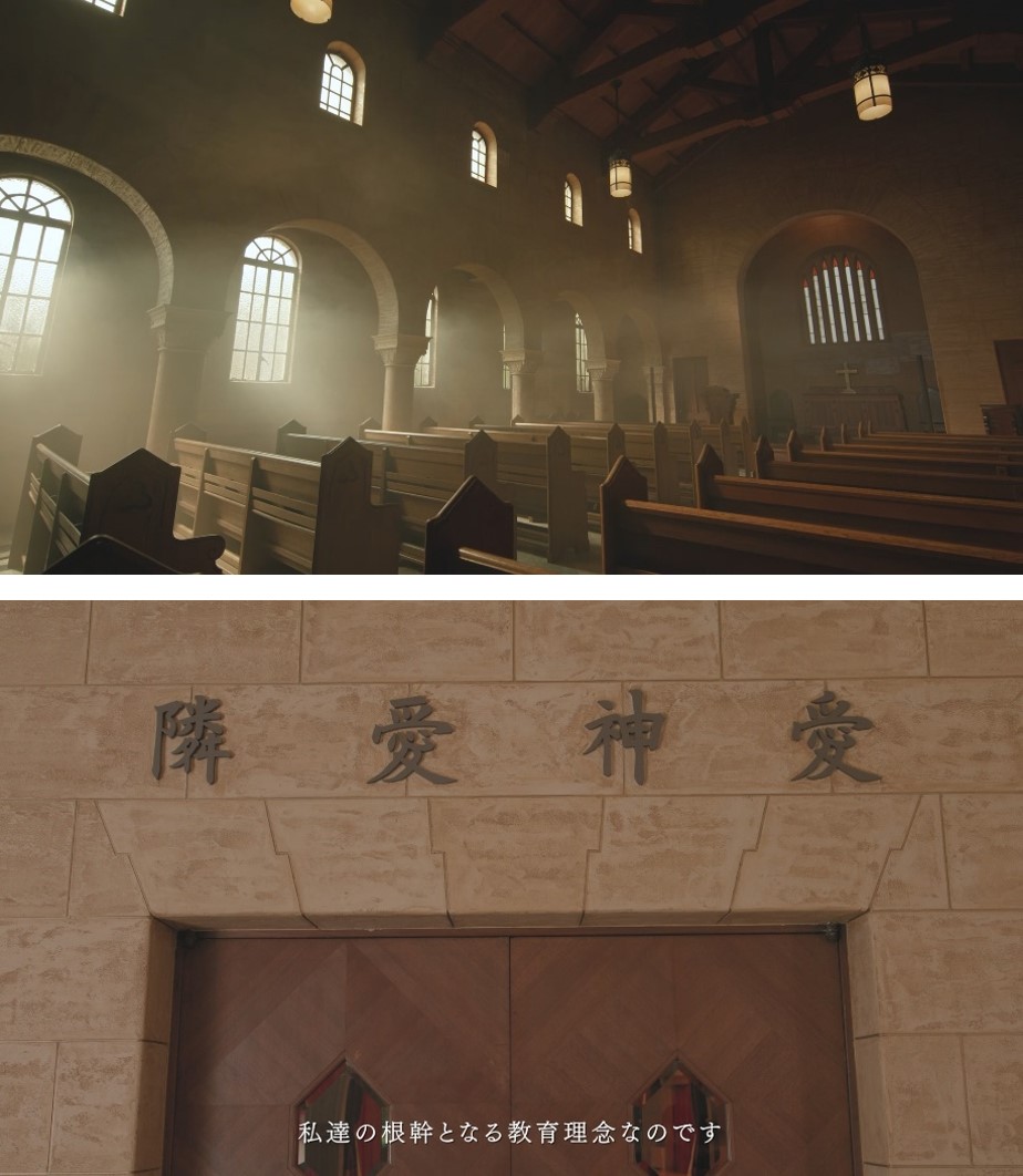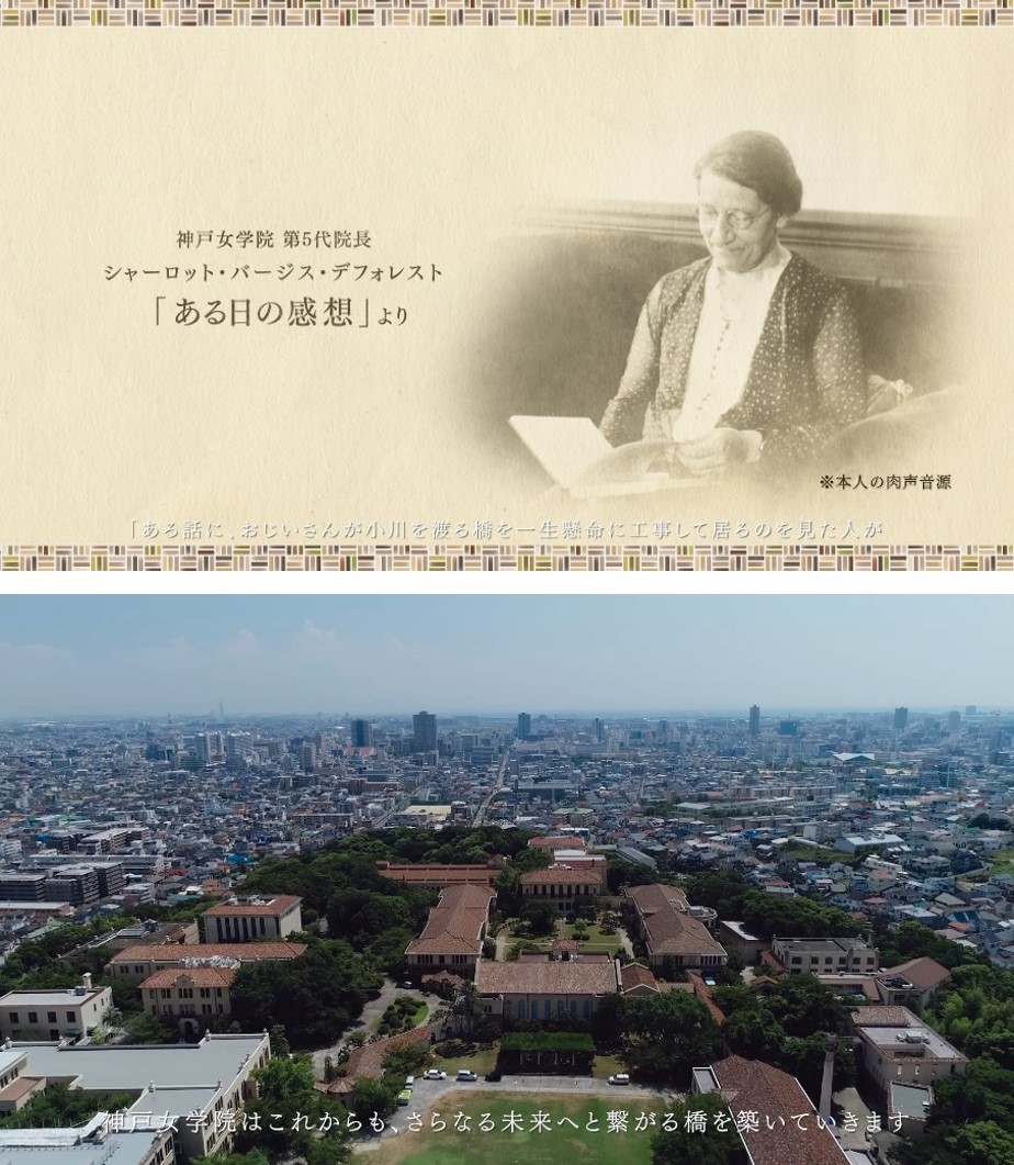 神戸女学院の校舎群は重要文化財でも有名ですが、その校舎に差し込む光やシルエットを神戸女学院の理念として擬人化したり、第5代院長デフォレスト先生の肉声を織り込むなど、情景を楽しみながらメッセージに込められた想いを伝えています。