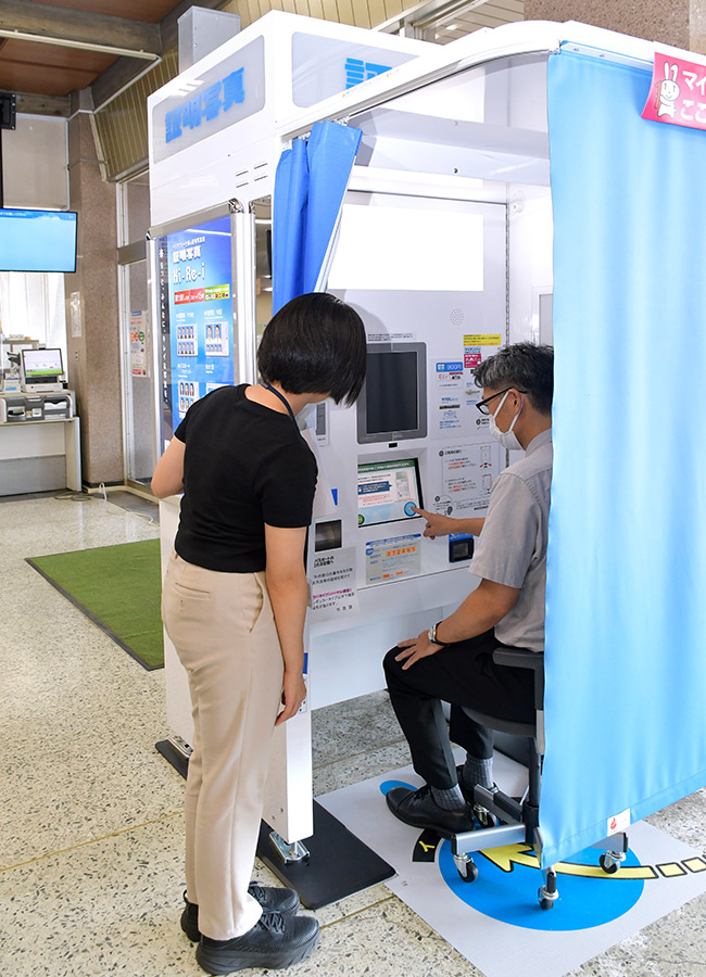マイナンバーカードの申請の際、以前は市⺠課窓⼝では対⾯により、職員が写真撮影をする無料申請サポートを実施していました。現在は証明写真機での無料申請が可能になったので、窓⼝に来られる市⺠の⽅は基本的に証明写真機に誘導して写真を撮影してもらい、職員が申請をサポートする⽅法に変更しています。窓⼝での申請の場合、利⽤規約への同意書類を印刷してサインをもらう必要がありましたが、証明写真機Ki-Re-iによる申請では画⾯に表⽰された利⽤規約の同意ボタンを押すだけなので、書類が1枚不要になりました。