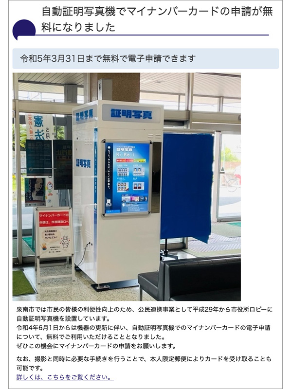 - 泉南市さまでは今後も証明写真機Ki-Re-iを活⽤し、マイナンバーカードの普及促進活動を続けていこうと考えています。