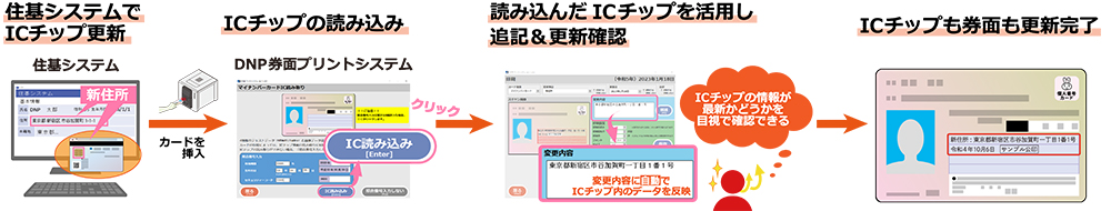 山武市では、住民からマイナンバーカードを預かり住基システムでIC情報を更新し、DNP券面プリントシステムにマイナンバーカードを挿入し、IC情報を読み込み、アプリケーション画面上に表示されたIC情報を追記担当者が間違いなく更新されているかを目視で確認後、読み込んだIC情報を活用し追記を行います。
