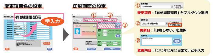 在留外国人がマイナンバーカードを取得している場合の在留期限延長に伴うマイナンバーカードの有効期限延長処理時の追記のシーンでアプリケーション上の変更項目に「有効期限延長」をテンプレート項目として追加することで、都度の追記の際に手入力する項目を減らしています。