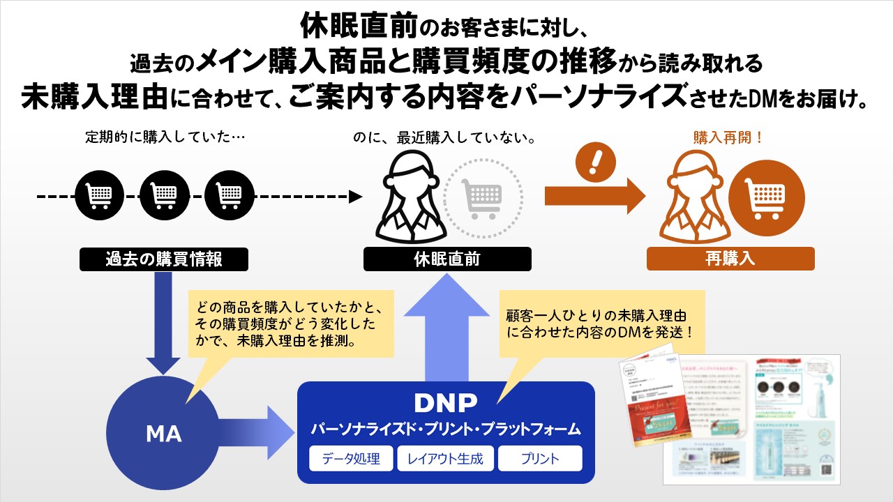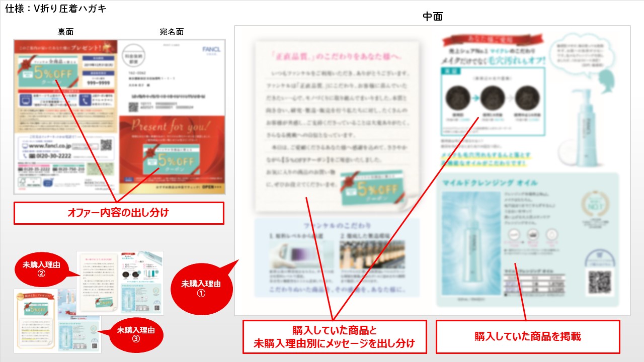 具体的には、ファンケル様で導入されているマーケティングオートメーションツール(以下、MA)にて、休眠直前のお客さまの過去の購入商品と購買頻度を抽出し、未購入要因をクラス分け。クラス分けされたお客さまリストを、DNPの「パーソナライズド・プリント・プラットフォーム」に連携いただくことで、購入商品と未購入要因別に最適化された訴求コンテンツを掲載したパーソナライズドDMを自動で生成・印刷・発送いたしました。