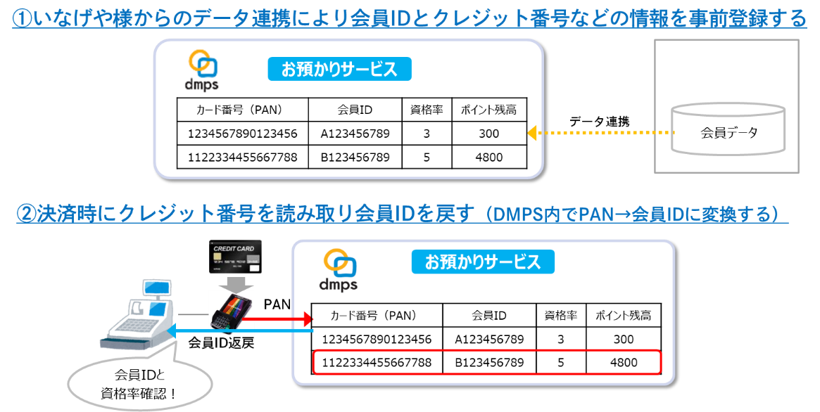 従来提供していたPOSによる提携クレジットカードへのポイント加算処理に対して、DNPの「カード番号お預かりサービス」を利用した提携カード判別機能を提供。難しいとされてきたポイント機能付き提携クレジットカードと現金ポイントカードとの併用が可能になりました。