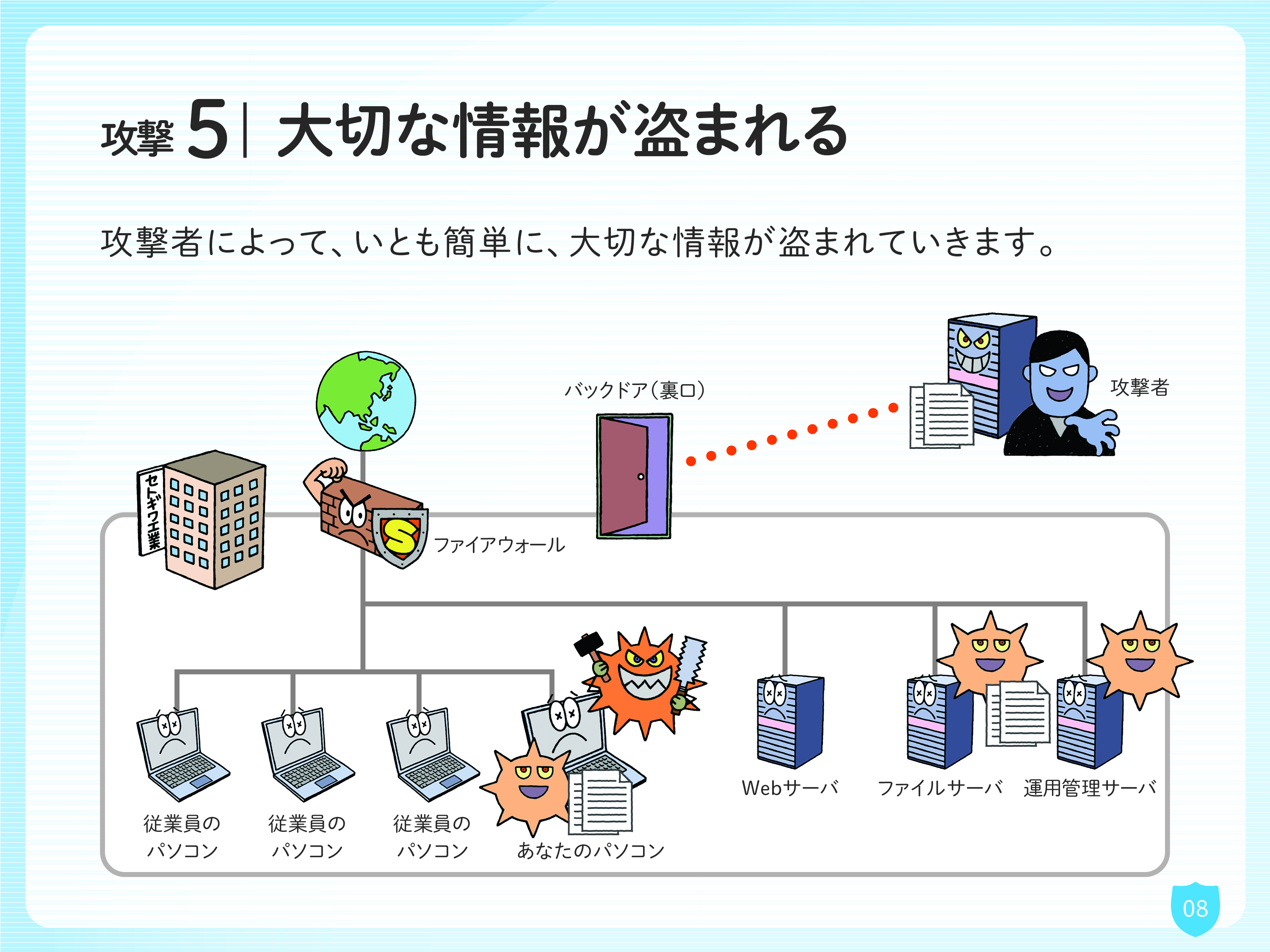 「DNP情報セキュリティeラーニング教材」は、情報セキュリティの危険が潜むシーンやシチュエーションをイラスト化し、専門用語を平易な言葉に置き換えて必要最低限の文字量で構成することで、受講者の負担を軽減しています。また、標的型攻撃メールなど、年々、複雑化していく攻撃手法についても、受講者がイメージしやすいようにイラストを使ってわかりやすく表現しています。