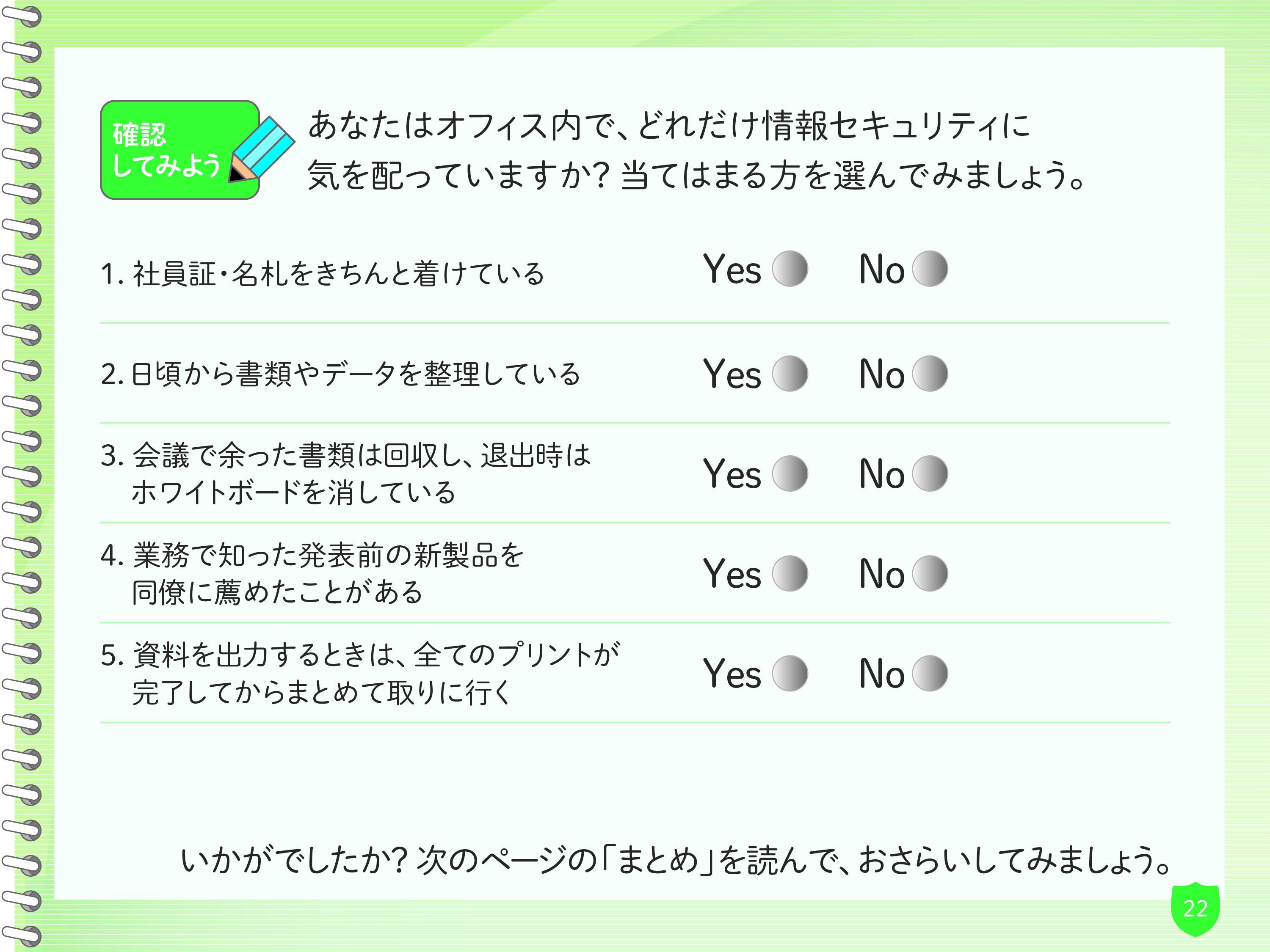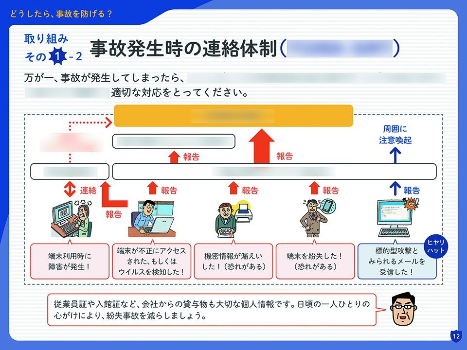 社内規程や、情報事故発生時の報告フローなどを盛り込んだ、オリジナル教材の例 |