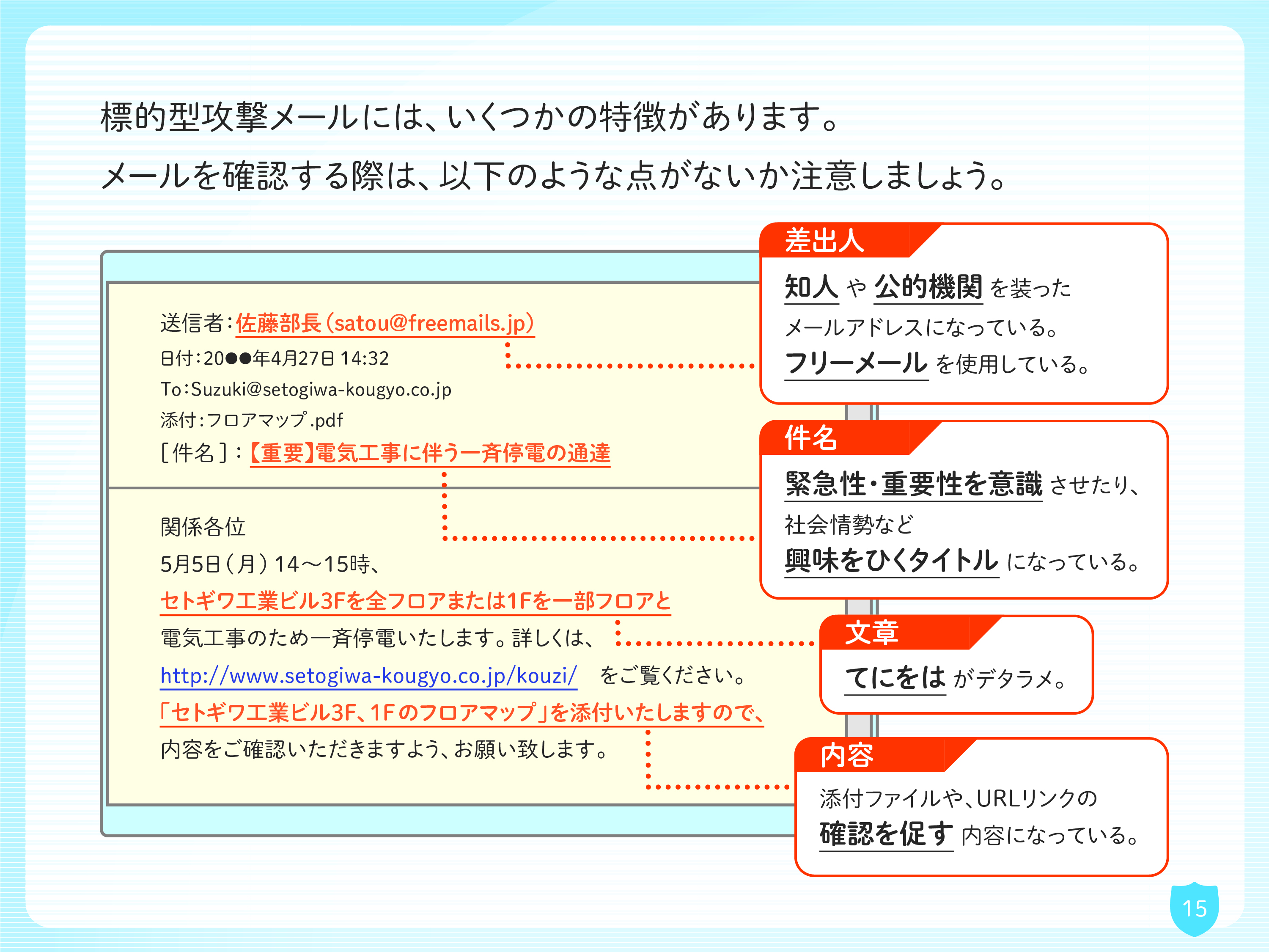 危険なメールの文例を挙げ、注意すべきポイントを具体的に解説するページの例 |