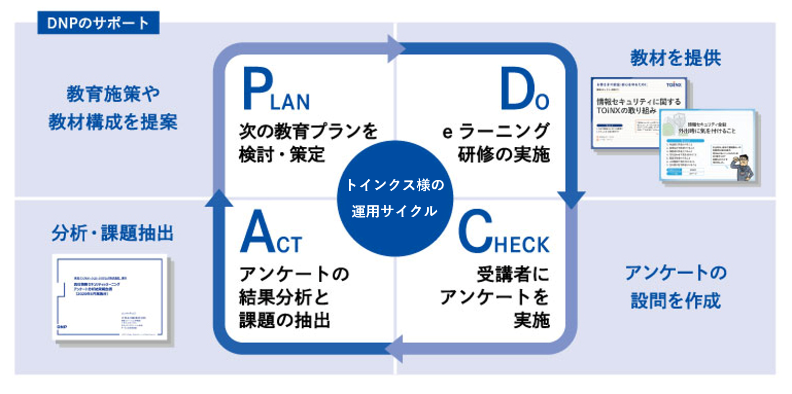 DNPのソリューションを活用した情報セキュリティ教育で、ITシステムを担う企業としてのガバナンスを強化するトインクス様。DNPは長年お客さまの重要情報を取り扱ってきた知見と教材制作のノウハウを強みに、同社の情報セキュリティ教育を多角的な視点で支援していきます。