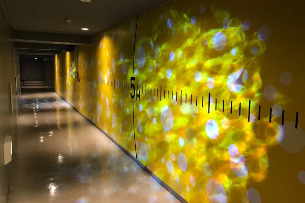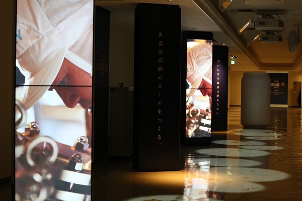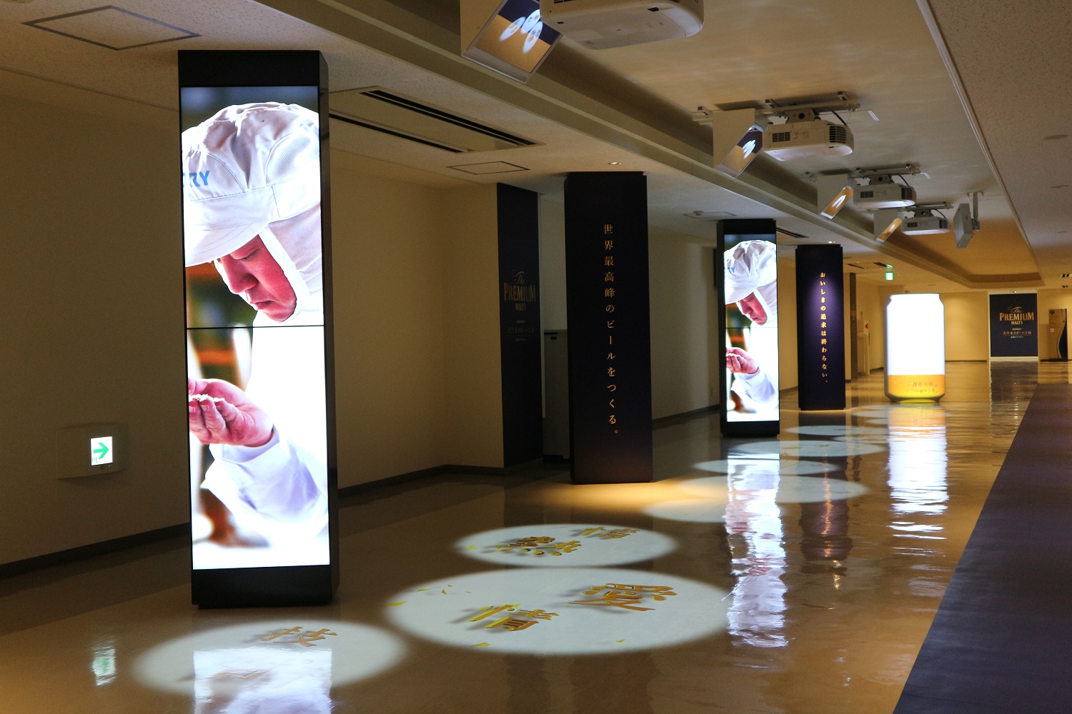 〈天然水のビール工場〉京都|工場見学コースにおいて、広い工場内の移動通路も含め全体の体験を設計し、ビールづくりの工程である発酵工程やろ過工程の見学通路を整備しました。それぞれの工程を分かりやすく伝え、グラフィックや映像、照明演出を駆使して、ザ・プレミアム・モルツのブランドの世界観に没入できる体感型の展示空間を構築しました。発酵工程では、ビールが発酵する様子を発酵タンクのイラストにプロジェクション映像で表現し、ろ過通路(醸造家ロード)では、音や映像を掛け合わせ、目には見えないビール醸造家の想いや情熱を可視化し、来場者にとって印象に残る工場体験をお届けしています。