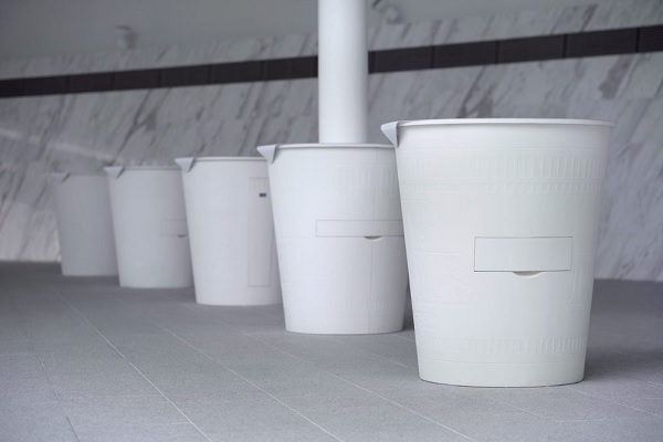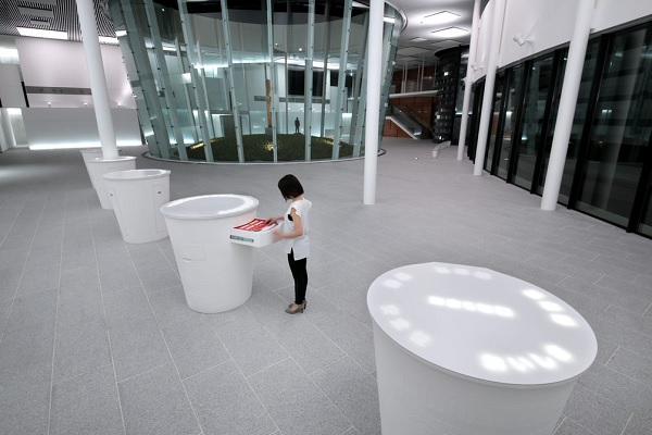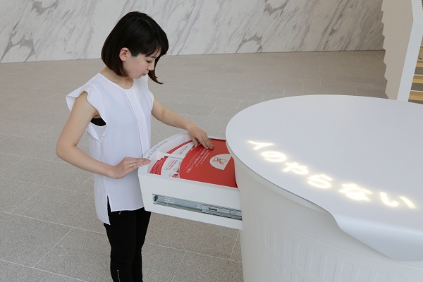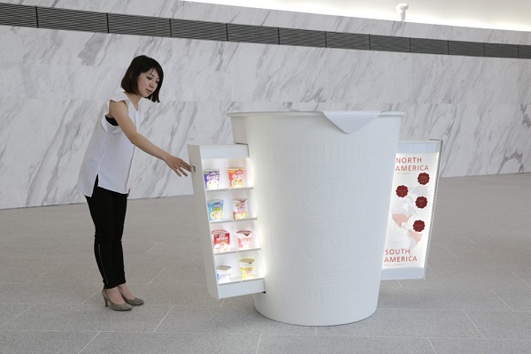 日清食品の主力商品である「カップヌードル」をモチーフとした5つの展示什器では、開発前のまっさらな状態をイメージし、真っ白なカップ造形で表現しました。それぞれにテーマ性を持たせて、引き出し形式の展示ギミックを採用し、能動的に展示コンテンツを楽しむことができるようにデザインを創出しました。展示を通して、同社の企業活動やビジョンを楽しく学び、ブランドの世界観を最大限に体感できる展示空間を構築しました。
