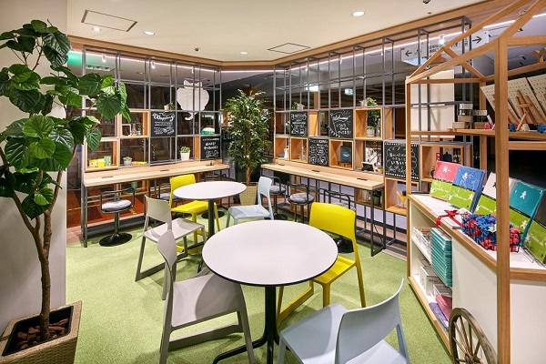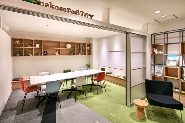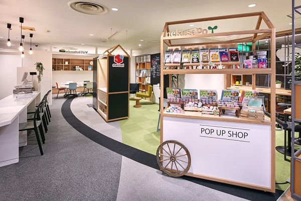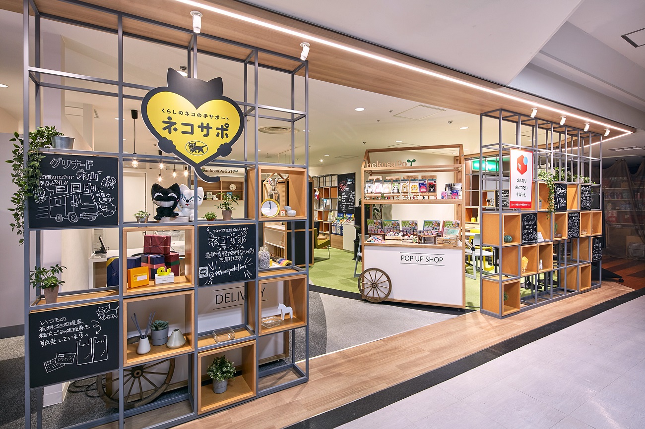 ネコサポステーションとは、ヤマト運輸が地域のお客さまの家事やお買い物など、快適な生活をサポートするためのコミュニティ拠点です。初めてショッピングセンター内に開設し、ユーザー層を広げるため、買い物を終えた生活者が自由に使える、ゆとりのあるフリースペースを備え、購入した商品等の自宅へのデリバリー・家事代行など生活をサポートするサービスを訴求する仕掛けとして、ファサードのグリッドシェルフやアイキャッチとしてディスプレイワゴンを配置しました。