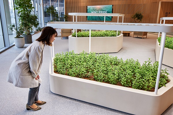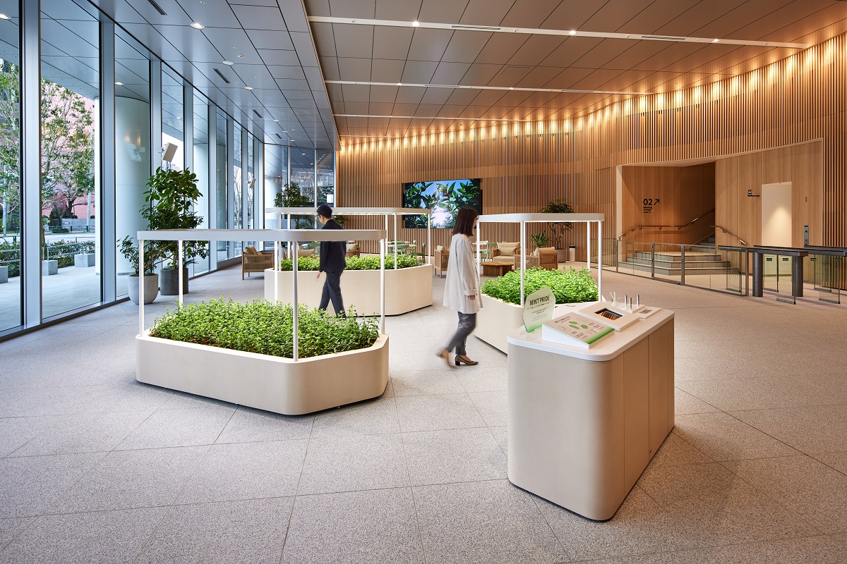 1階エントランスでひときわ輝きを放つミント畑は、創業時から天然ミントにこだわるライオンの想いを感じていただき、ミントを五感で楽しんでいただけるライオンならではの象徴的なスペースとなっています。計画段階では、室内環境でミントを育成するための、照度設定や育成方法における検証も支援しました。