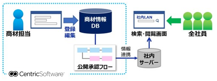 クラウドのデータベース(Centric PXM)と、スクラッチ開発した検索・閲覧画面(Webブラウザベース)という構成で、この2つをAPIで連携しています。Centric PXMの商材情報データベースには、商材担当者が登録・編集を行います。登録した商材は、承認フローを介し上長から承認が得られれば公開となる仕組みです。公開された商材は、検索・閲覧画面を通じて全社員が閲覧することができます。なお、データベース項目の増減や名称変更などについては、マーケティング本部が運用を担当しています。