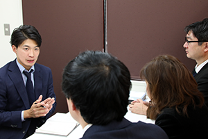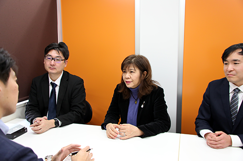 | 赤羽法務事務所の皆様にDNPアイディーシステム上野がインタビューする様子 |