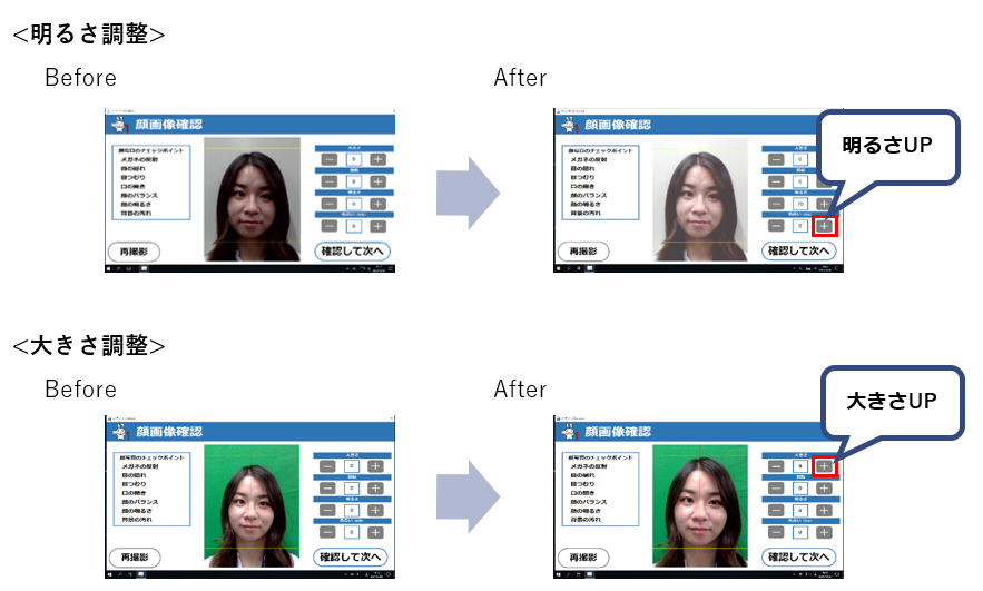 マイナ・アシスト2では顔写真撮影後、タブレット上で明るさや大きさなどの調整が可能です。
