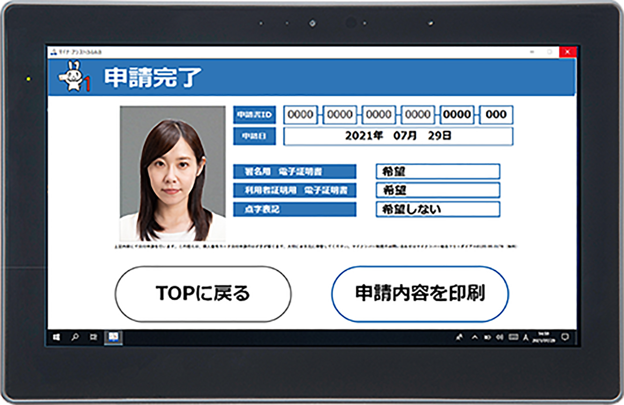 「通常のタブレットでオンライン申請をする場合は、申請が完了した旨の通知が登録したメールアドレスに届きますが、マイナ・アシスト2だとメールアドレスの登録がないため、申請が完了したことを知らせるメールは届きません。そのため小平市では、マイナ・アシスト2で申請完了していることを案内するため、マイナ・アシスト2の申請完了画面右下の「申請内容を印刷」ボタンを押して、用意したプリンターでカラー印刷しています。市の保管用と市民の控え用で2枚出力していますが、カラー印刷にすることでどんな写真で申請したかわかりやすいため、市民の方にも安心して申請を行っていただけています。」