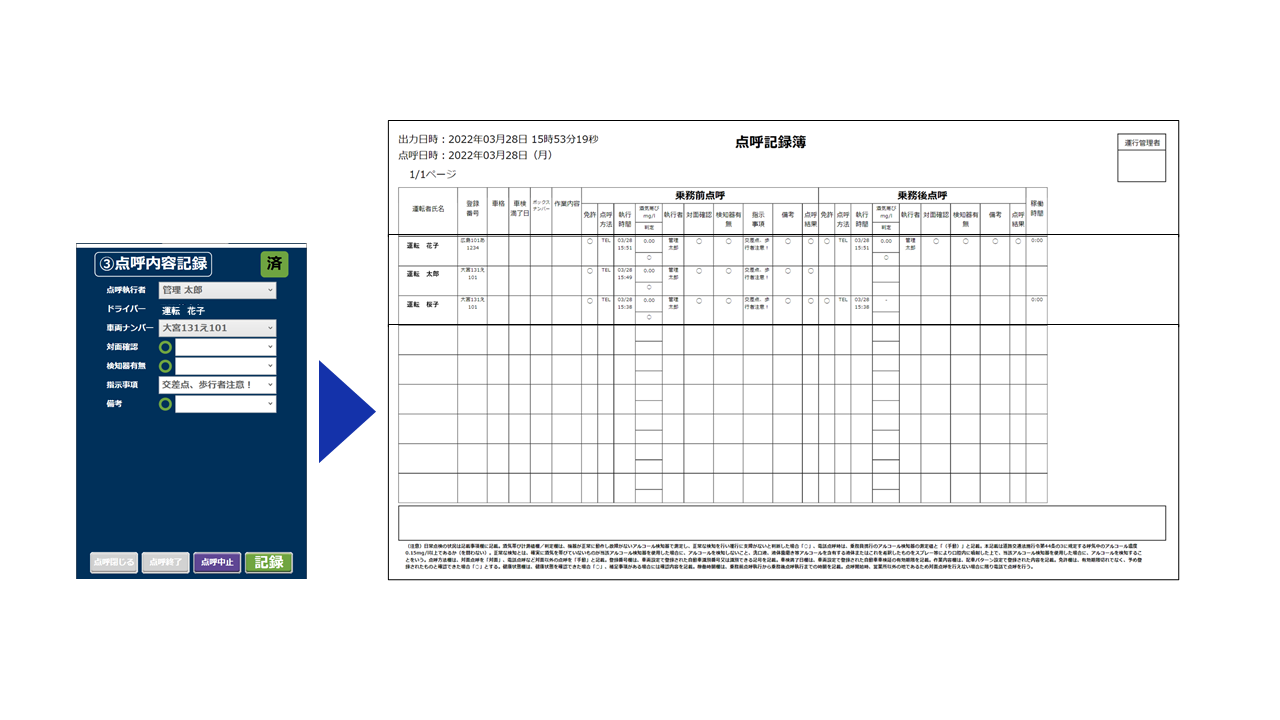 確認した項目およびアルコールの計測結果を自動で帳票化できます。