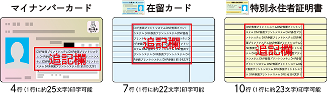 マイナンバーカードの追記は、今までの在留カード(約22文字)/特別永住者証明書(約23文字)/住民基本台帳カード(約25文字)等と比較し、追記欄の行数が少ないので追記欄に記載できる文字数が1行約25文字、4行で約100文字と44%減少※2しているため、限られたスペースへの印字を考慮する必要があります。