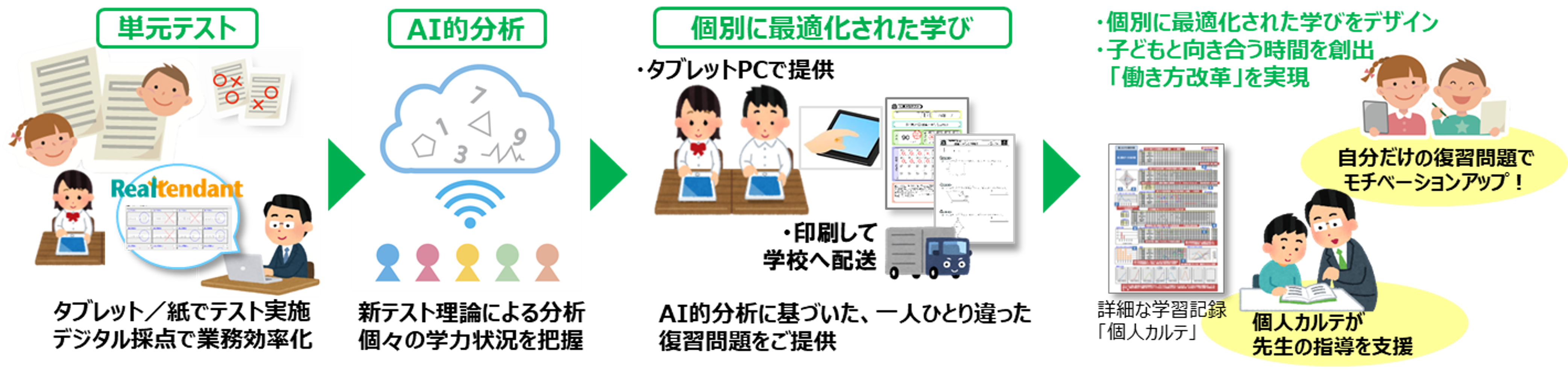 リアテンダントは、「様々な教材」 と「学習支援機能(データ蓄積、集計・分析)」で、「個別に最適化された学び」の実現を目指すクラウドサービスです。(※センターサーバへの導入も可能です。)先生の業務を効率化しながら指導の質を高める、学校の「働き方改革」を推進することができます。