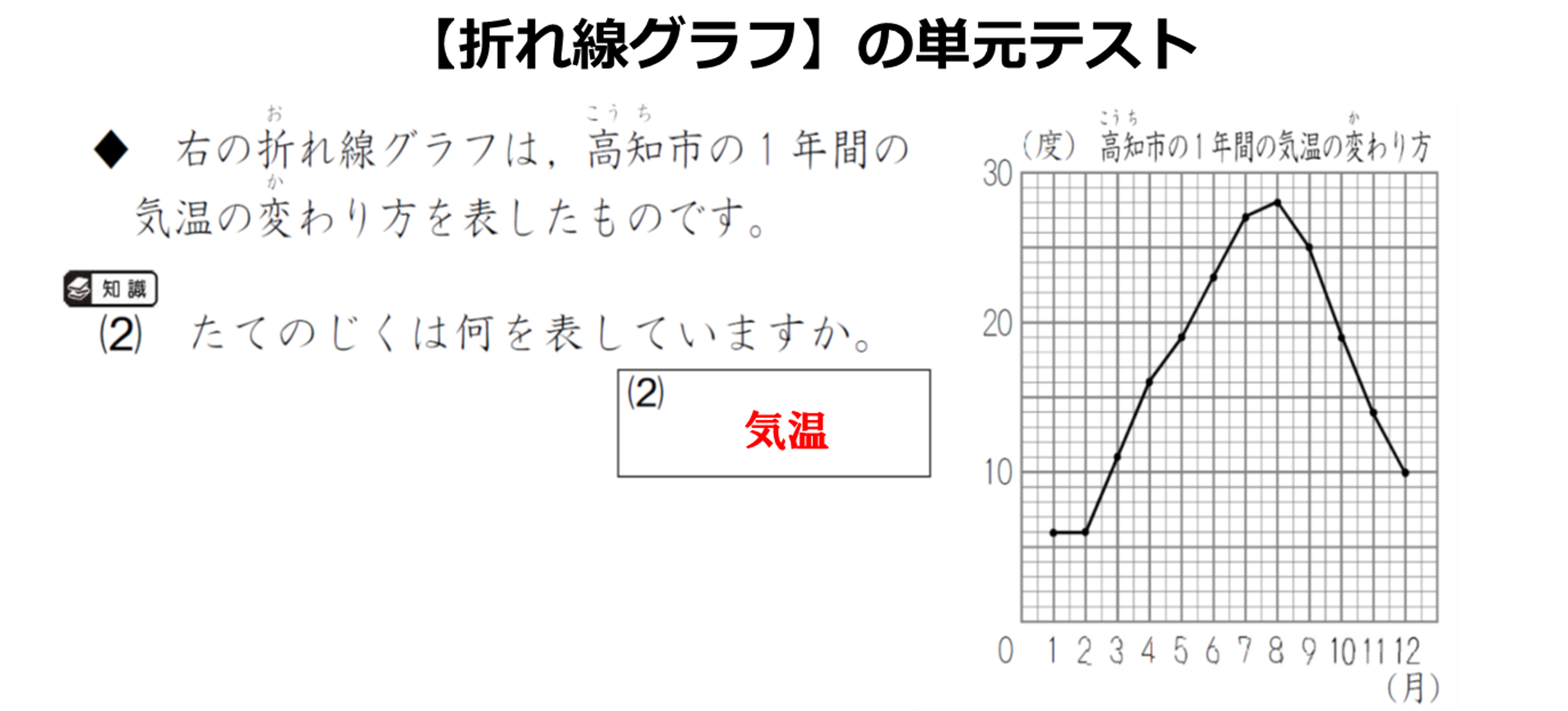 こうした取り組みの一例が、「折れ線グラフの“縦の軸”が何を表しているか?」という問題の分析です。「この問題は、熟練の先生クラスの正答率が100%だったのに対し、若手の先生クラスは61%に留まっていました。誤答分析したところ、正しくは“気温”と解答すべきところ多くの児童が“温度”と誤答していることが分かったため、正しい表現で解答する様に若手先生から児童にあらためて指導をすることにしました。」
