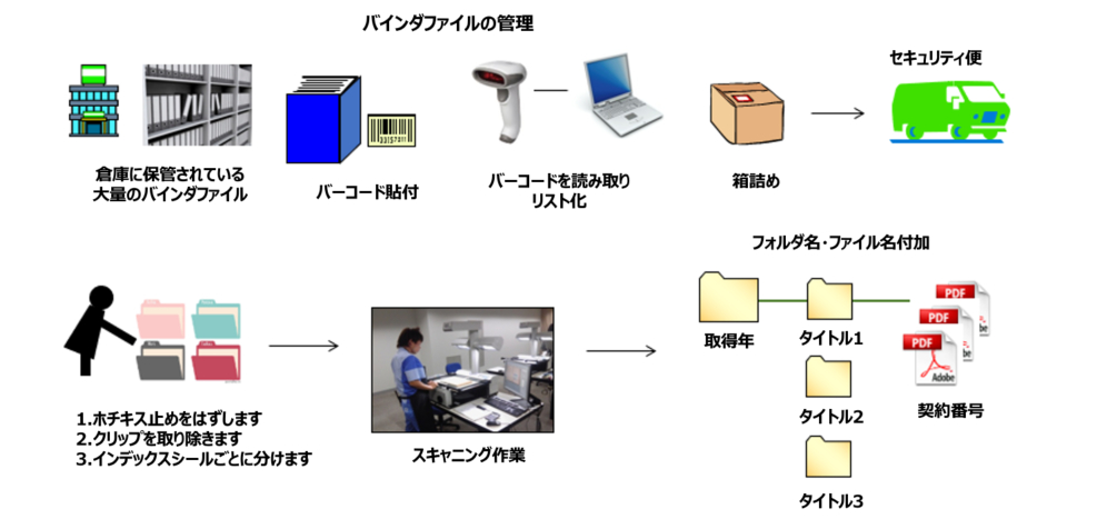 - 引き取り時、バインダファイル1冊ごとバーコードシールを貼付、リーダーで読み取り、引き取り管理、返却時も同様の管理を行った。
