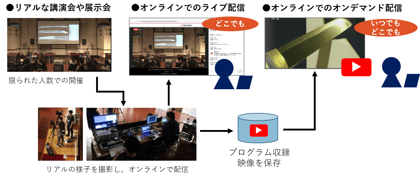 ハイブリッド文化体験プログラムとは、リアルな会場とオンラインの両方で展示鑑賞会を楽しむことができ、さらにプログラム終了後もアーカイブした映像を活用することのできるニューノーマルなプログラムです。