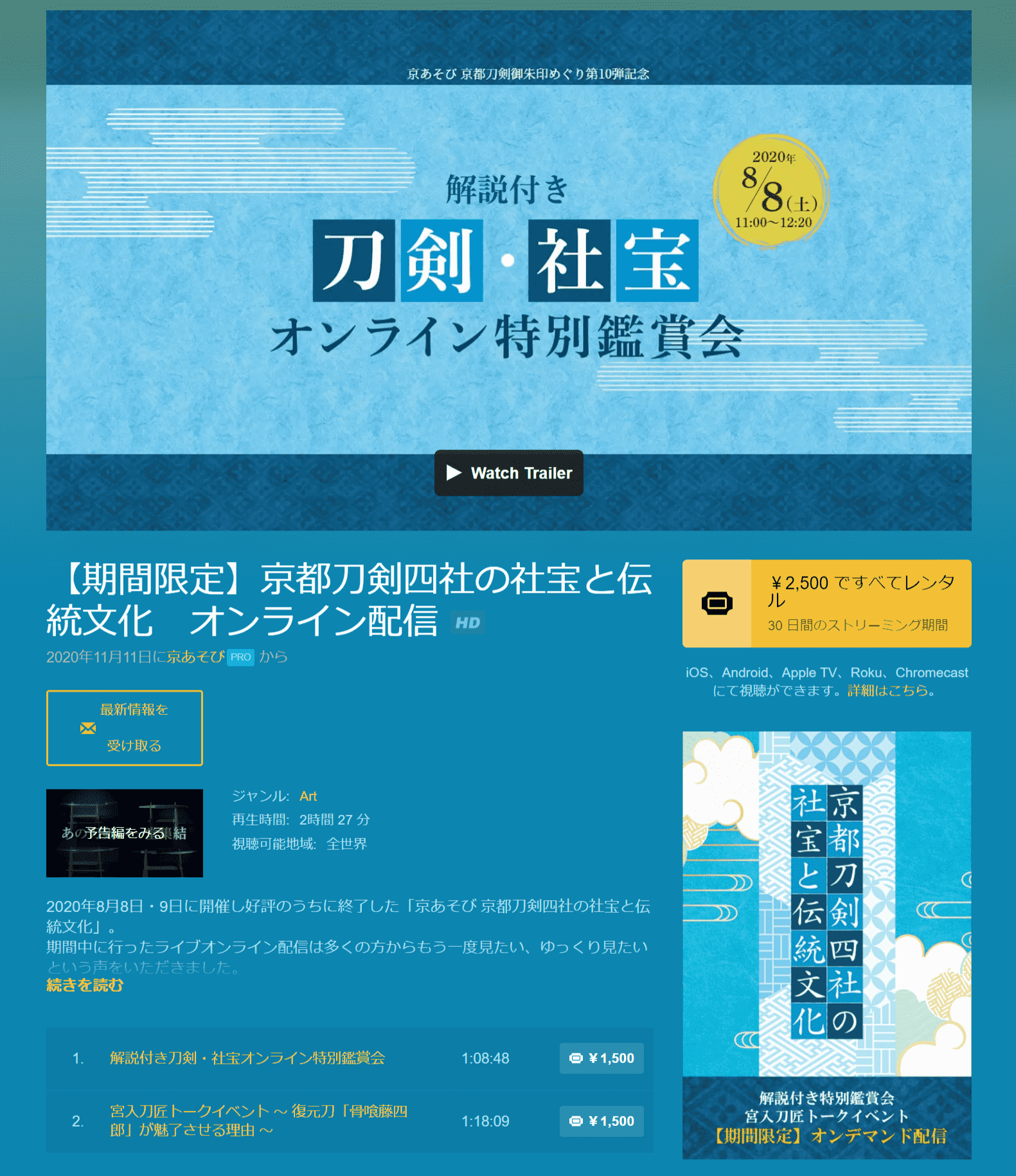 2020年8月8日(土)・9日(日)に日本刀にゆかりのある京都刀剣四社(粟田神社、建勲神社、豊国神社、藤森神社)の協力のもと、京都文化博物館の別館にて、リアル会場での鑑賞とオンラインライブ配信での鑑賞を行うハイブリッド文化プログラムを開催いたしました。