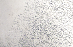 相国寺方丈室中の間にかかっている観音菩薩は江戸時代文化年間に活躍した江戸の人、加藤信清(1734~1810)によるもので、全て法華経の経文によって画かれている。法華経の中の普門品(ふもんぼん)第二十五は観音経と呼ばれ、観音様について説かれたものである。文字を連ねて像の輪郭を象る文字絵の起源は古いものですが、信清の文字絵はさらに色面までもが文字で埋め尽くす緻密さと、その完成度において孤高の存在と言われている。