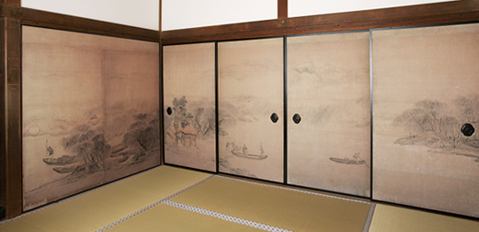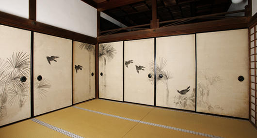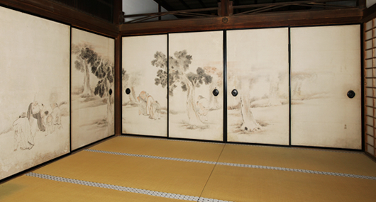 ◆西の間与謝蕪村:紙本墨画淡彩「棕櫚に叭叭鳥図」襖 12面◆室中の間与謝蕪村:紙本墨画淡彩「飲中八仙図」襖 12面◆東の間池大雅:紙本墨画淡彩「琴棋書画図」襖 12面◆上官の間与謝蕪村:紙本墨画淡彩「山水人物図」襖 4面、壁画 12面