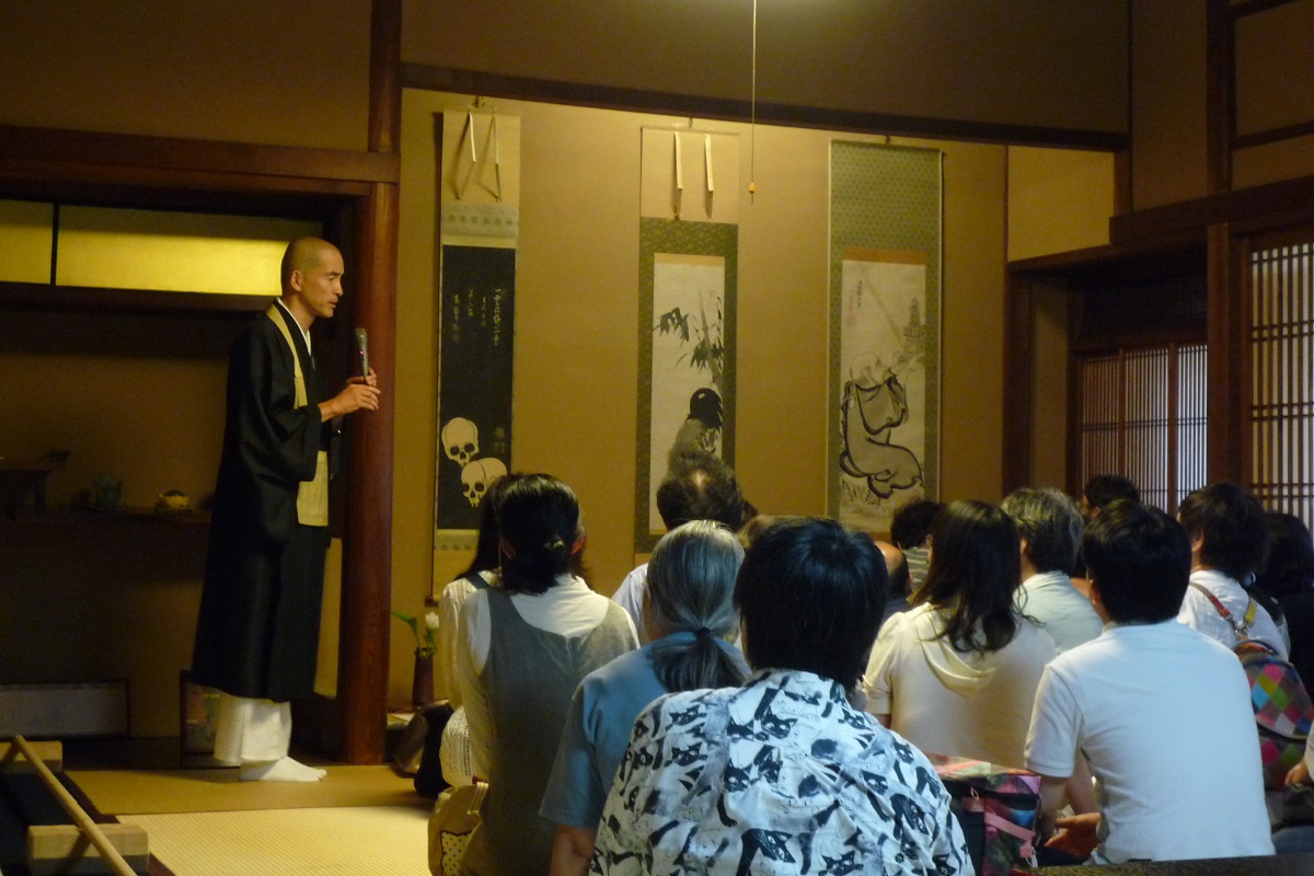 本堂では小島ご住職による法話を、書院では若冲の傑作「髑髏(どくろ)図」「竹に雄鶏図」に加え、この度新たに発見された、若冲の弟であり、弟子でもある白歳作の「南瓜雄鶏図」他全6点の、詳細な解説付きでの鑑賞をお楽しみいただきました。