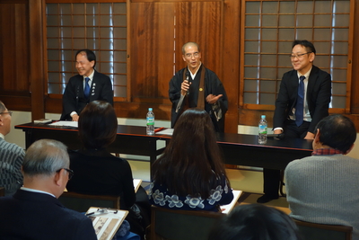 後半は、小島ご住職と岡田先生のトークショー。当初は偽物と言われていた「竹に雄鶏図」がしまいこまれていた過去、岡田先生と宝蔵寺との出会い、ご朱印の爆発的ヒットなど、若冲とともに語られる宝蔵寺の歴史から、若冲に関係の深い絵師たちの作品を大切にしていこうという未来への展望まで、多岐にわたったお話が繰り広げられました。