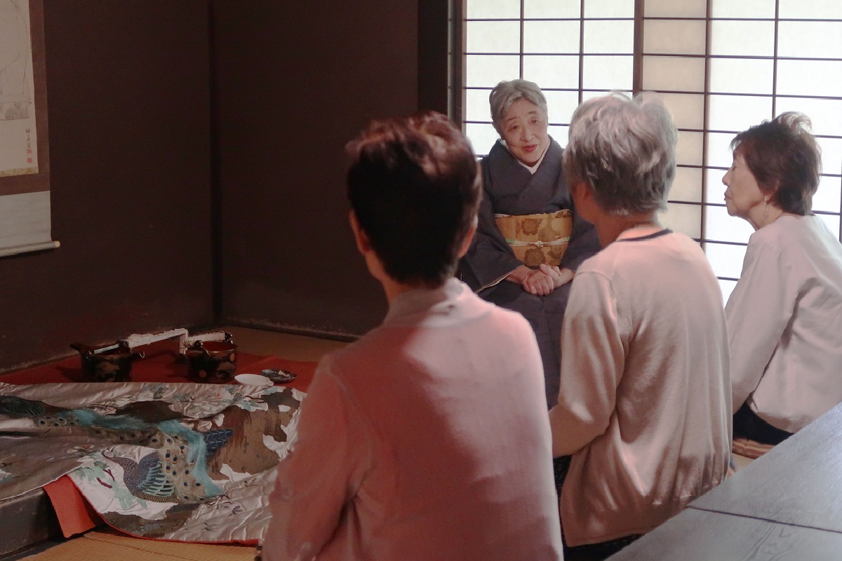 邸宅を見学した後、製作過程を見学した引千切と、歌子さんがたてたおうす(お抹茶)をご賞味いただき、杉本家住宅で過ごす四季の暮らしをまとめた4K映像で、見学いただけない場所や季節の室礼(しつらい)を鑑賞していただきました。変化していく時間の中で「同じことが無事にできる」幸せを感じること、「変わらない場所」の安心感を与えられる場所であることを守っていきたいという歌子さんの言葉が、とても印象的なプログラムでした。