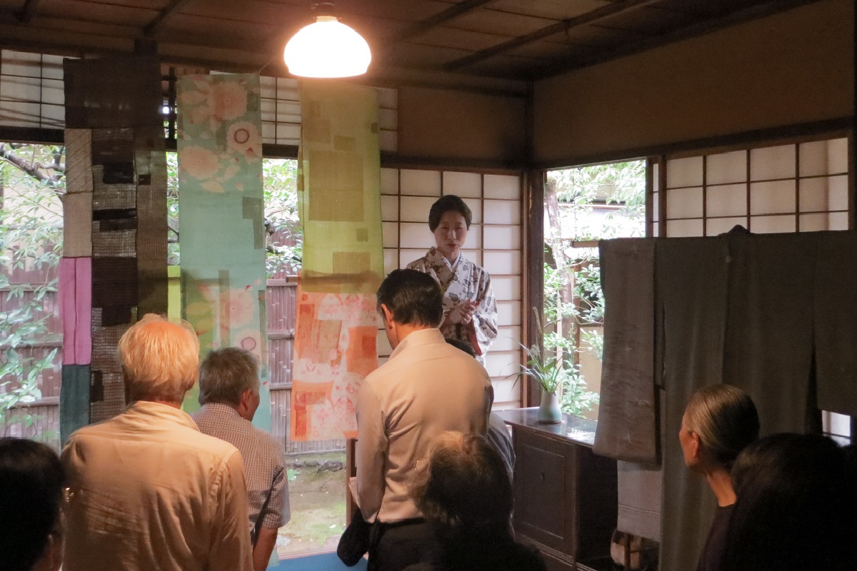 続いて、歌子さんのご案内で、邸宅内を仏間、茶室、八畳の間の順に見学しました。昔、度々京都を襲った大火事の経験から地下に石室を備えた仏間であること、茶室にかけた短冊にある広隆寺の「牛祭」が奇祭といわれる所以など、興味深いお話とともに巡り、八畳の間では展示された晴れ着と常着を鑑賞。生地が透けるほど継ぎを当てて使い込まれた布や、上村松園の絵にも出てくる当時一般的だったお針箱、鮮やかな糸をかけて手作りされた指ぬきなど、つつましやかな生活の中にもひと手間、ひと工夫を惜しまない杉本家の人々の知恵が感じられる貴重な品々も並びました。