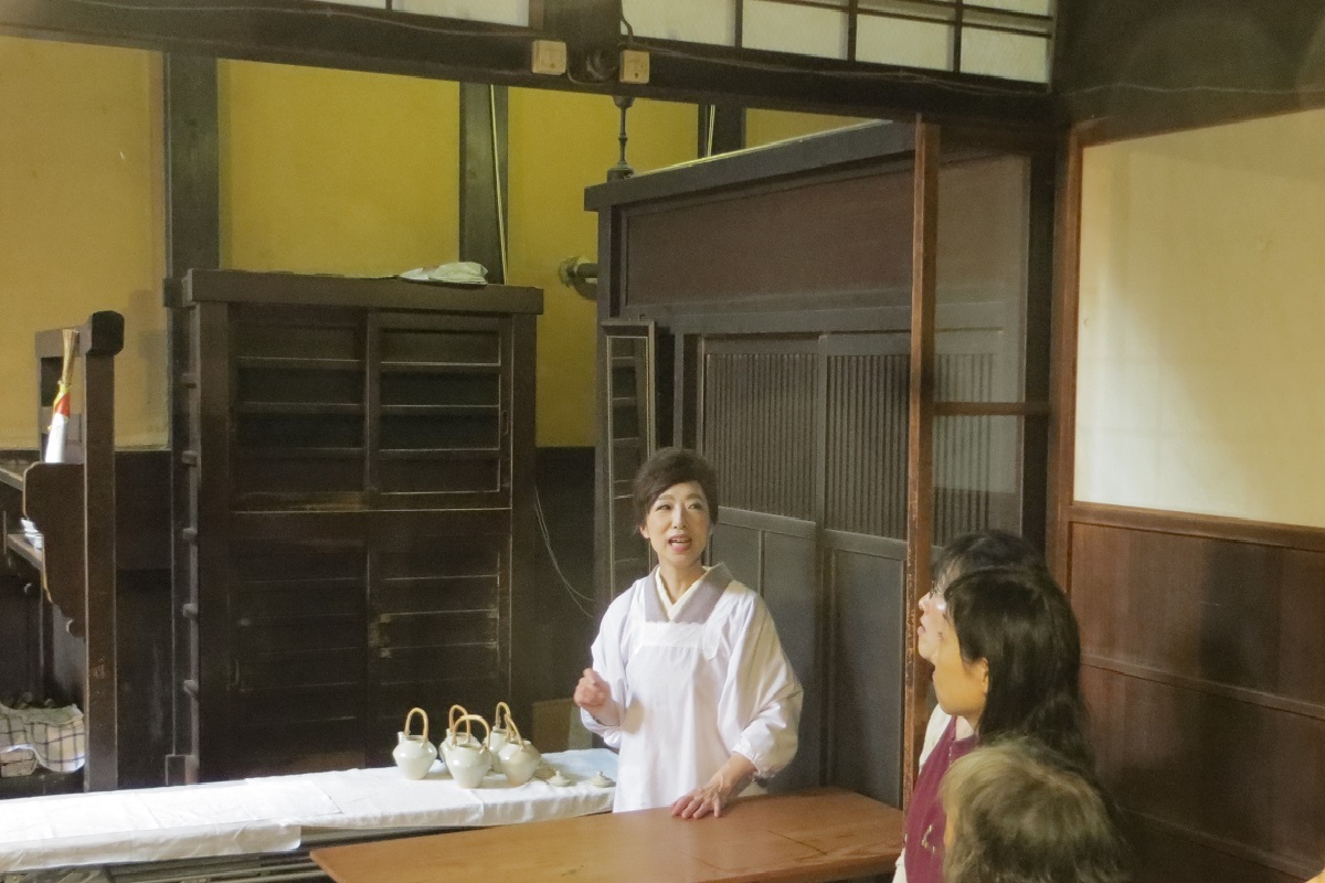 はじめに、杉本家10代目当主杉本節子さんから、杉本家の歴史と当時の暮らしについてのお話がありました。多くの使用人を抱え、生活も支えた商家には、日々の暮らしの工夫が積み重ねられ記録された「歳中覚(さいちゅうおぼえ)」が受け継がれてきたことなどが紹介され、皆さん複製本を手に取りながら興味津々で見入っておられました。