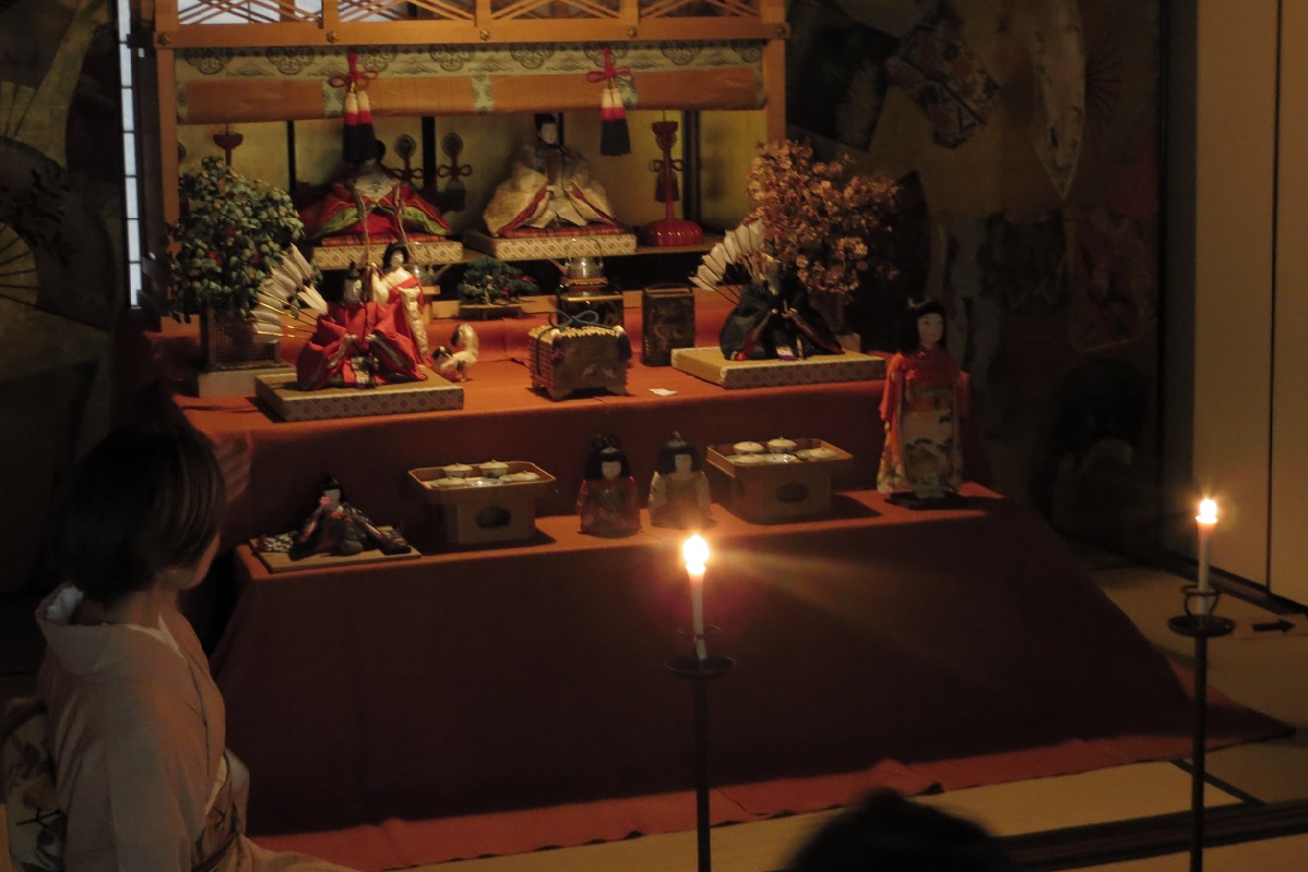 杉本家9代目杉本秀太郎氏の三女としてこの家に生まれ育った杉本歌子さんの解説で、雛人形の由来や当時の生活に想いを馳せ、和ろうそくの明かりで杉本家所蔵の屏風や人形を鑑賞して、電灯では味わえなかった奥行きや影の存在に気づかされたり、手あぶりで暖を取る幸せを体感したりと、京町家で過ごす時間をゆったりと堪能していただきました。