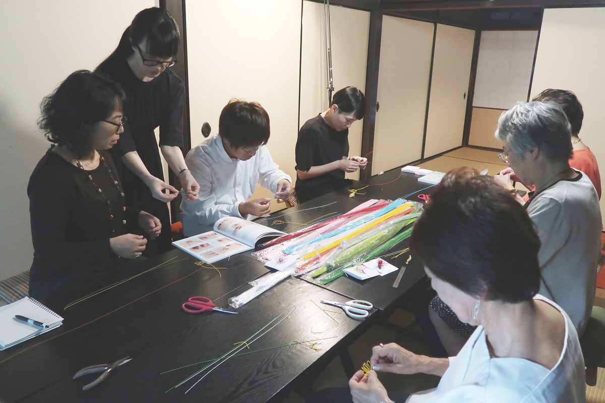 最後に、水引作家で和工房包結主宰の森田江里子さんのご指導の元、結納や贈答にかかせない水引細工の製作を行いました。バラや菊、桜などを形作る中で手先の細かな作業があり、それぞれ苦心しながらも、和気あいあいとした雰囲気の中で皆さんしっかりと完成させることができました。