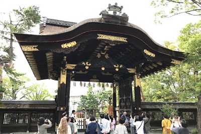 豊臣秀吉と北政所ねねを祀る神社の成り立ち・歴史等を解説いただいた後、普段は通ることができない名工・左甚五郎作の鯉や鶴などの見ごとな彫刻が施された国宝「唐門」をくぐり、「唐門をくぐると出世できる」という謂れに皆さん喜ばれていた様子です。