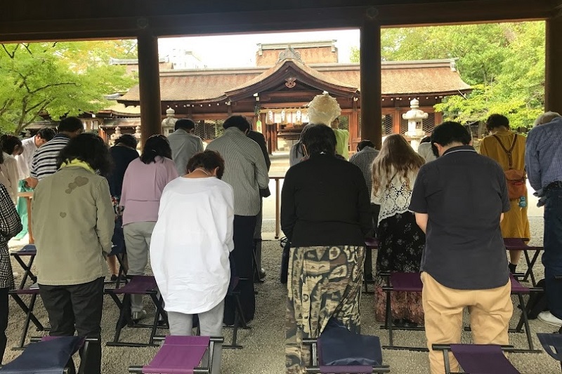 書院での挨拶の後、拝殿での参拝からプログラムが始まり、普段なかなか体験することのない「正式参拝」の儀式で、少しの緊張感と共に皆さん雰囲気を楽しんでおられました。玉串奉奠の儀式に選ばれた代表者1名とともに、二礼・二拍手・一礼で締めくくり、その後お1人ずつ御神酒が振る舞われました。