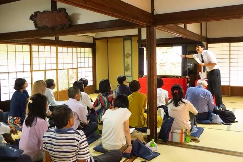 書院に戻ってからは豊国祭礼図屏風(伝匠美®)の鑑賞が行われ、京都国立博物館の特任研究員である山本英男先生による解説が行われました。豊臣秀吉の七回忌がいかに盛大に行われたか、屏風に描かれた人物の様子について詳しく解説を聞くことで、当時の生活を深く学ぶことができました。参加者は真剣な眼差しで屏風を見つめ、描かれた当時に想いを馳せていました。