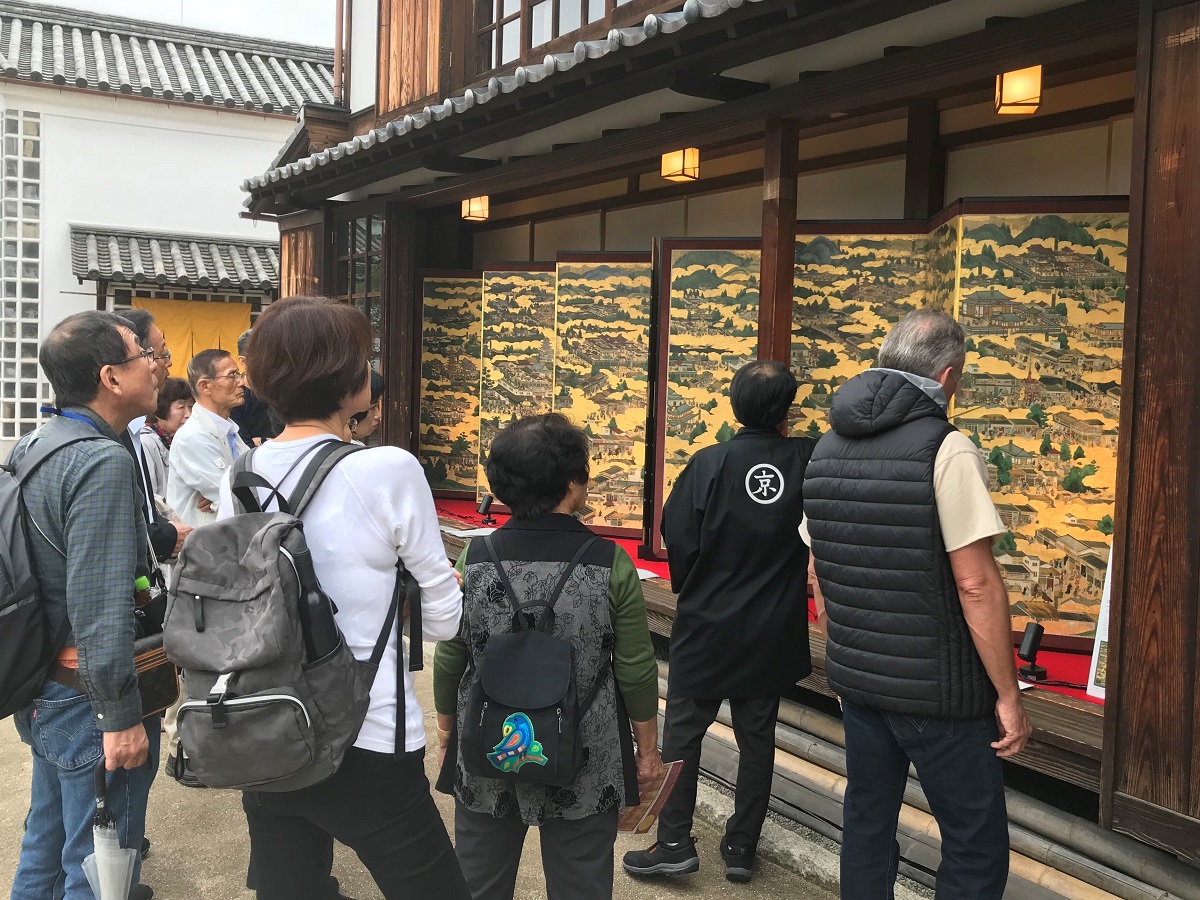 爽やかな秋晴れのもと、岡山県倉敷市にて阿智神社の秋祭りに合わせて開催された「倉敷屏風祭」。今回、京あそびとして倉敷の皆様に江戸時代初期の京の町を描いた屏風を楽しんでいただくため「伝匠美® 屏風祭り展」を開催しました。倉敷でも京都祇園祭の屏風飾りと同じ風習があり、各家々が通りに面した戸を外し、屏風や生け花を飾って訪れる人々をもてなします。
