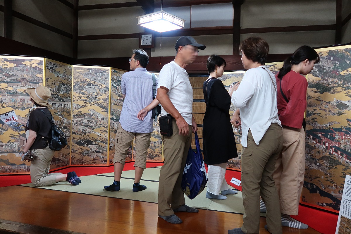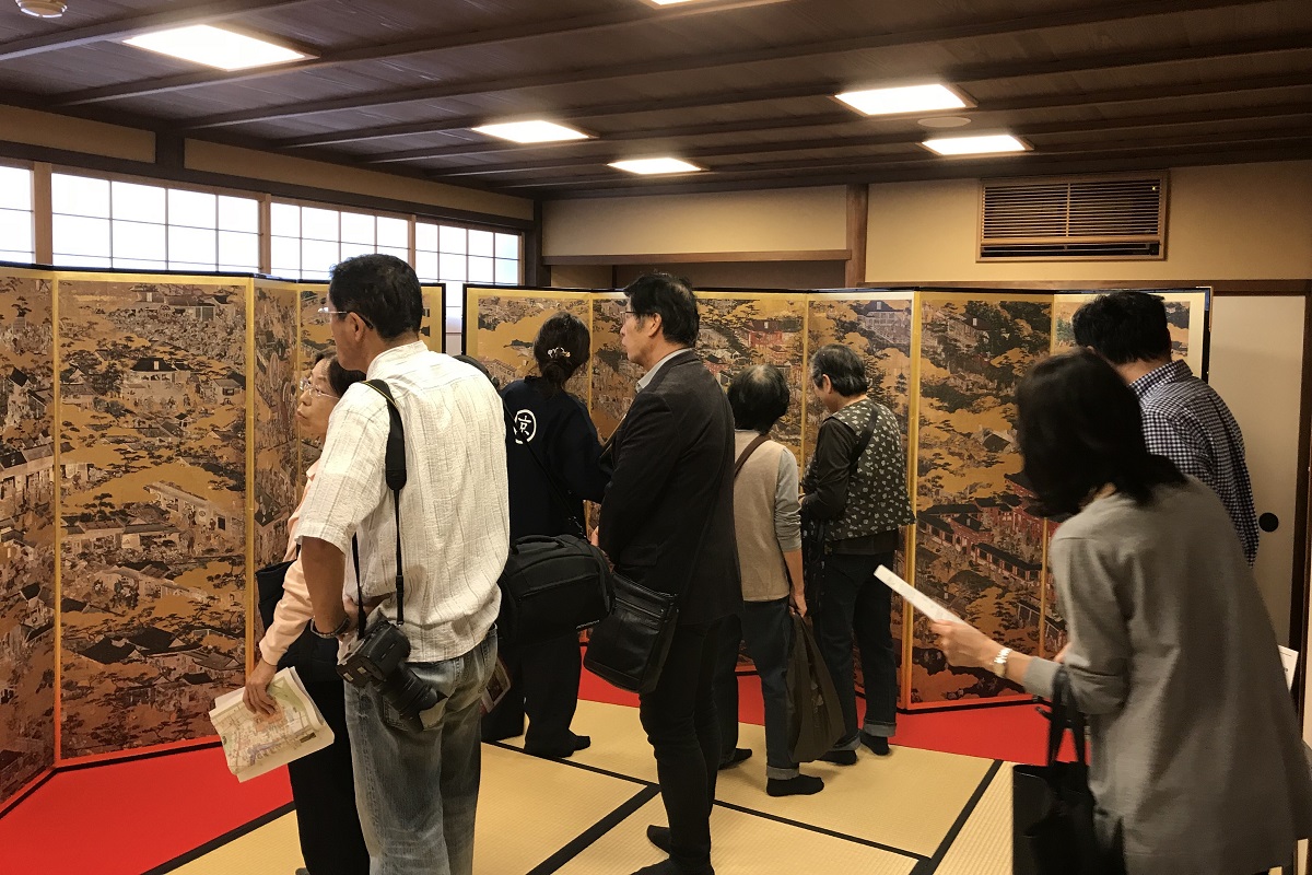 開幕式が終わると、早速畳の上に上がっていただき、普段は博物館でしか見ることのできない屏風絵を間近にじっくりと鑑賞いただきました。
