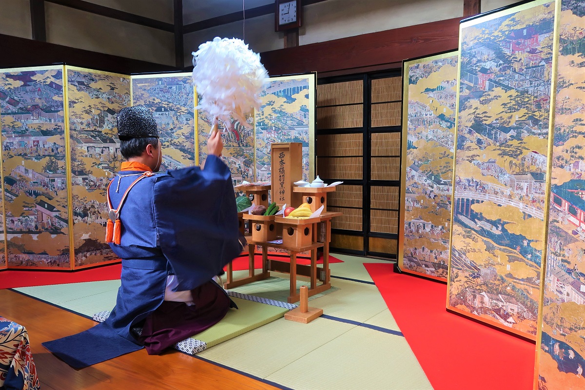 真っ青な秋空が広がる中、伝匠美®の「洛中洛外図屏風 舟木本」の設えられた町屋(村上市コミュニティデイホーム)で、開幕式がひらかれ「町屋の屏風まつり」の成功を祈願するご祈祷が行われました。