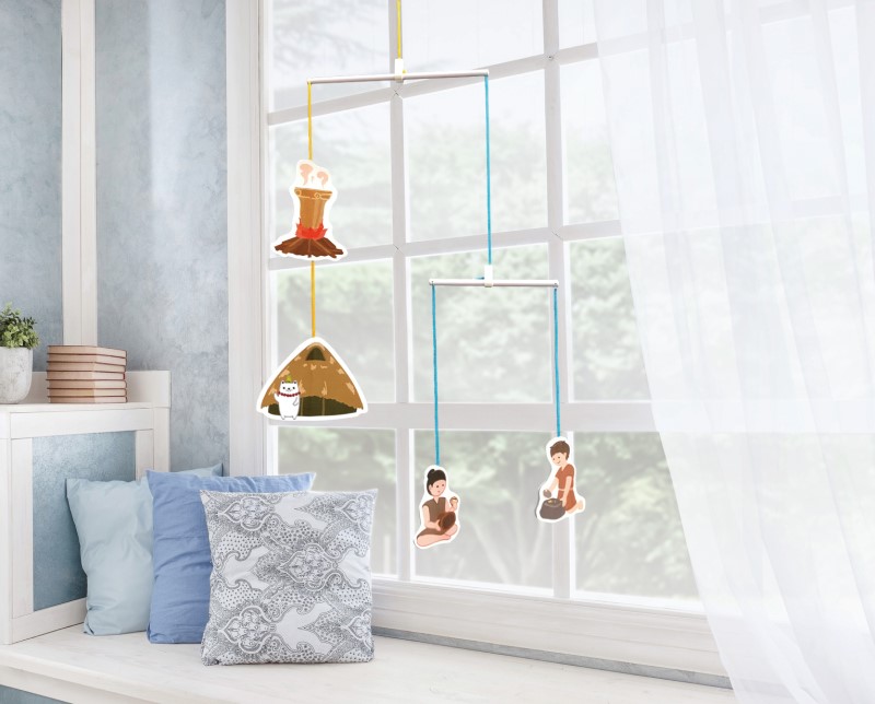 左右でバランスをとりながら縄文をモチーフにしたパーツがゆらゆら揺れるモビールです。