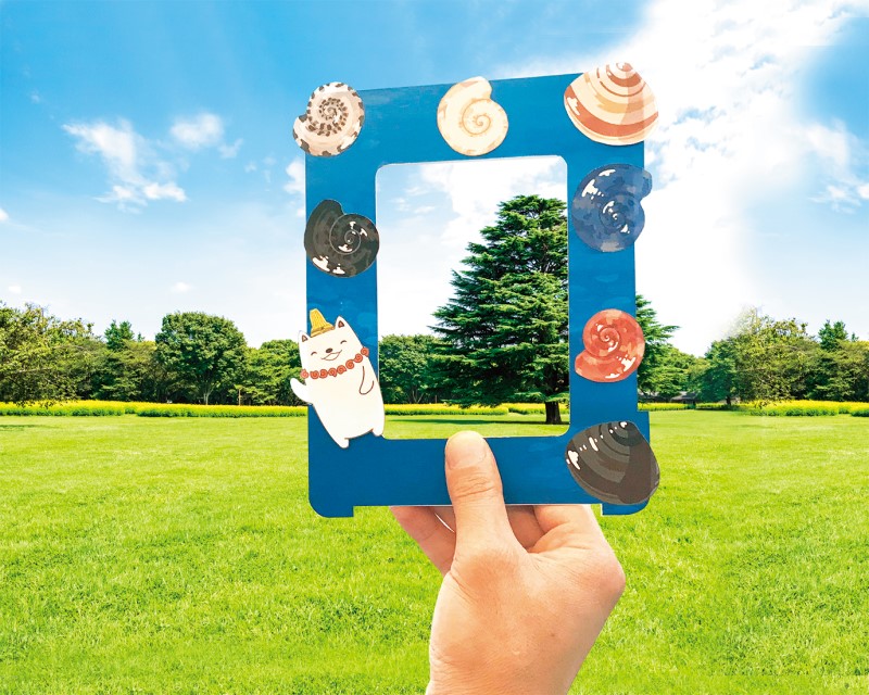 フレーム型の台紙に縄文をモチーフにしたパーツを自由に貼り付け装飾します。完成後は施設敷地内を散策しながら、フォトフレーム越しに風景を撮影して遊びます。